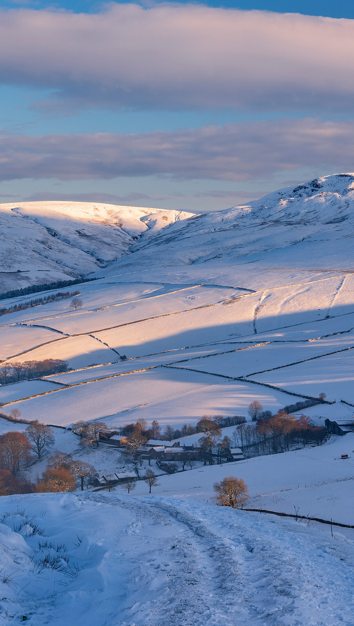 A magnificent 4K wallpaper unveils the Kinder Scout winter landscape across the snow-draped Peak District at sunrise. Golden light dramatically illuminates the undulating snow-covered slopes, casting deep blue shadows that delineate fields and valleys, evoking a serene yet crisp winter morning.