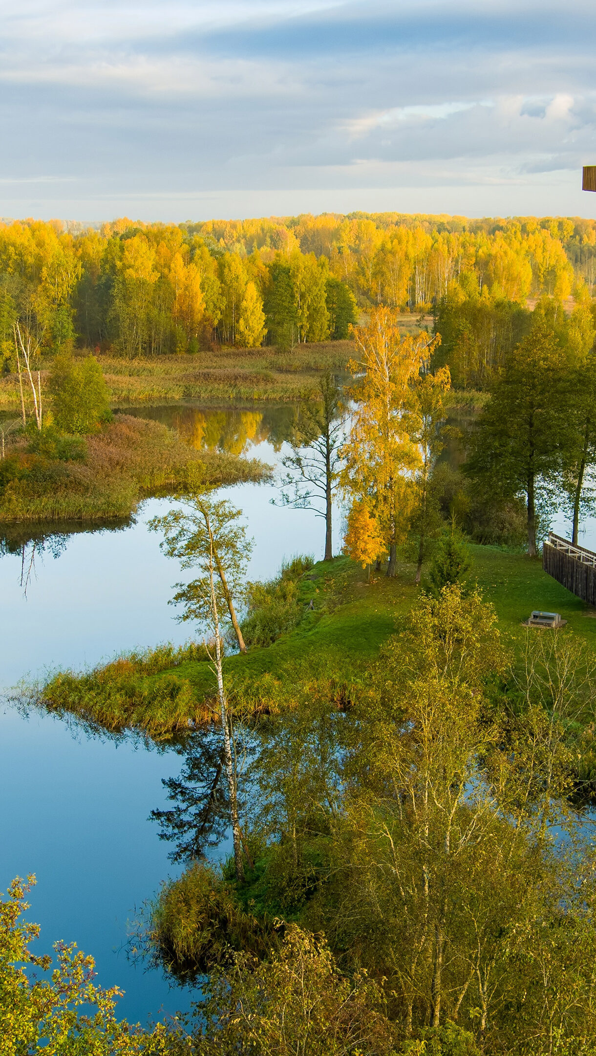 A breathtaking 4K wallpaper captures the Kirkilai Lakes Lookout Tower overlooking an expansive autumn landscape within Biržai Regional Park, Lithuania. The unique crescent-shaped tower stands amidst numerous calm lakes and forests ablaze with brilliant golden and orange foliage under a soft, diffused sky.