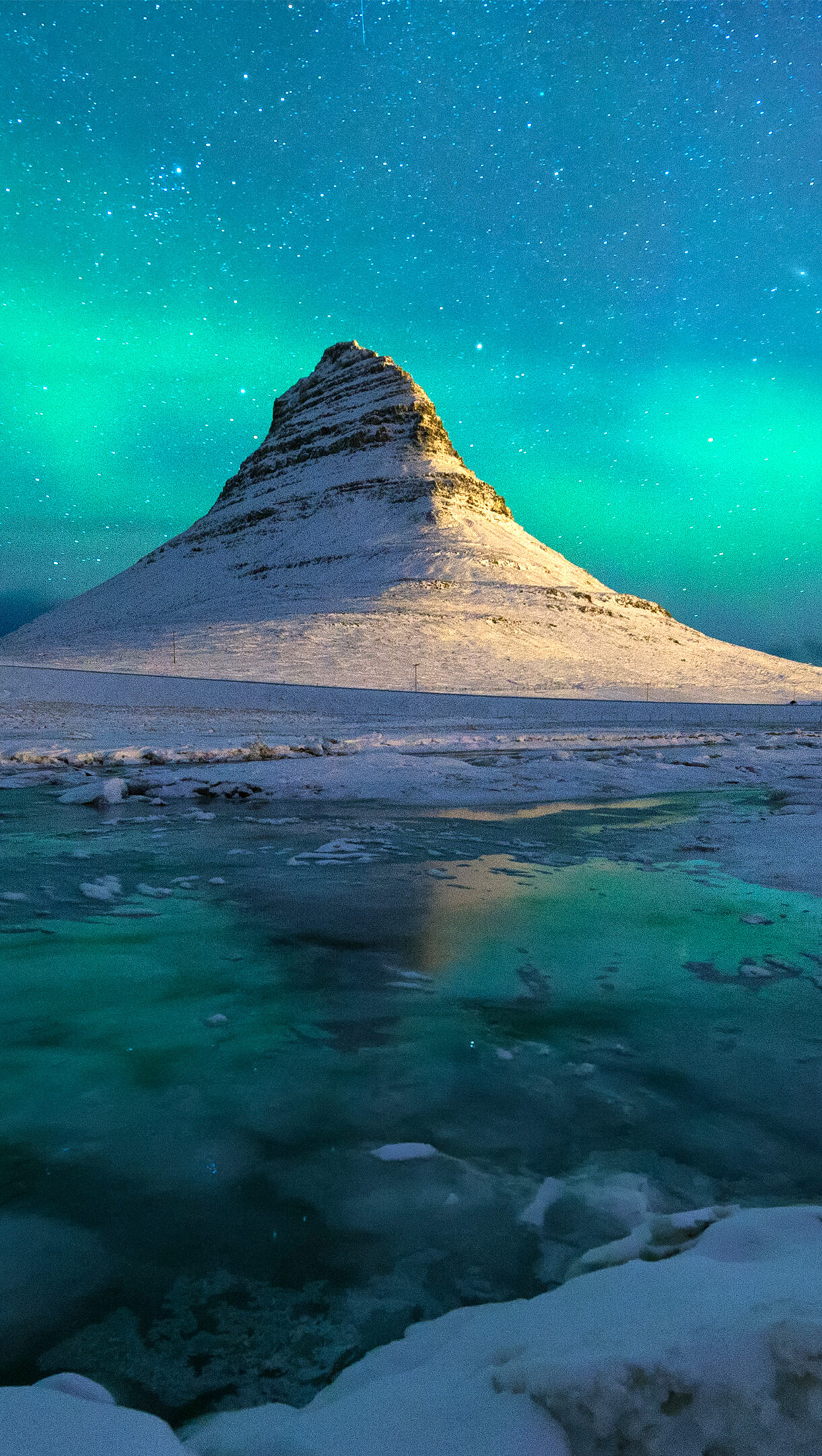 An ethereal 4K wallpaper of Kirkjufell Mountain, snow-covered and majestic, standing in a serene winter Icelandic landscape under the swirling Aurora Borealis. The mountain's illuminated peak and the vivid green-blue Northern Lights are mirrored flawlessly in the still, partially frozen water, enhancing the scene's breathtaking magic.