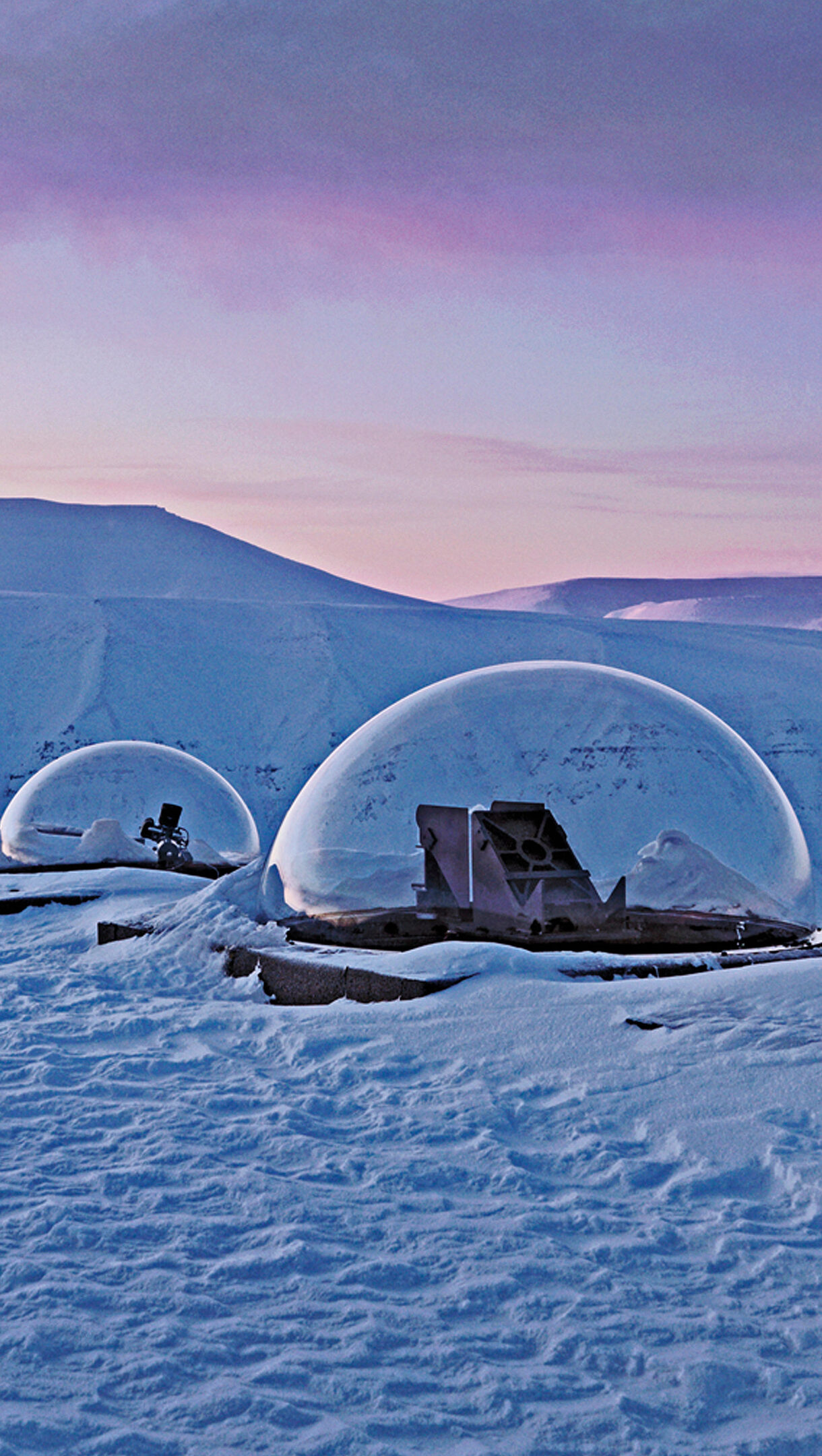 A breathtaking 4K wallpaper showcases the Kjell Henriksen Observatory's scientific domes lining a pristine, snow-laden winter landscape in Svalbard, Norway. The dramatic contrast between the frigid, expansive snow and the sky's vibrant purples and pinks evokes a sense of serene isolation.