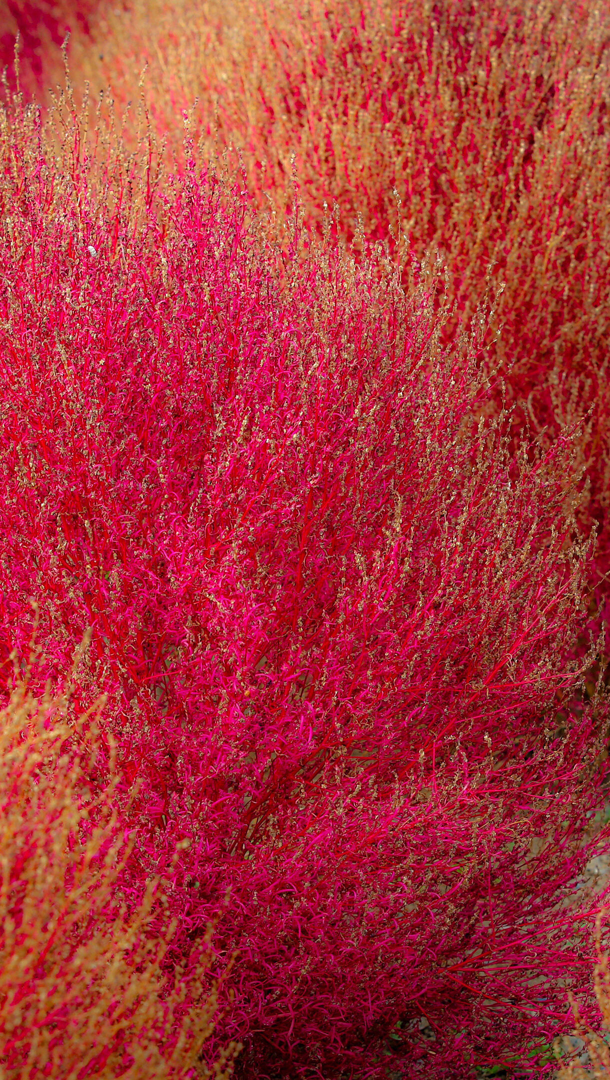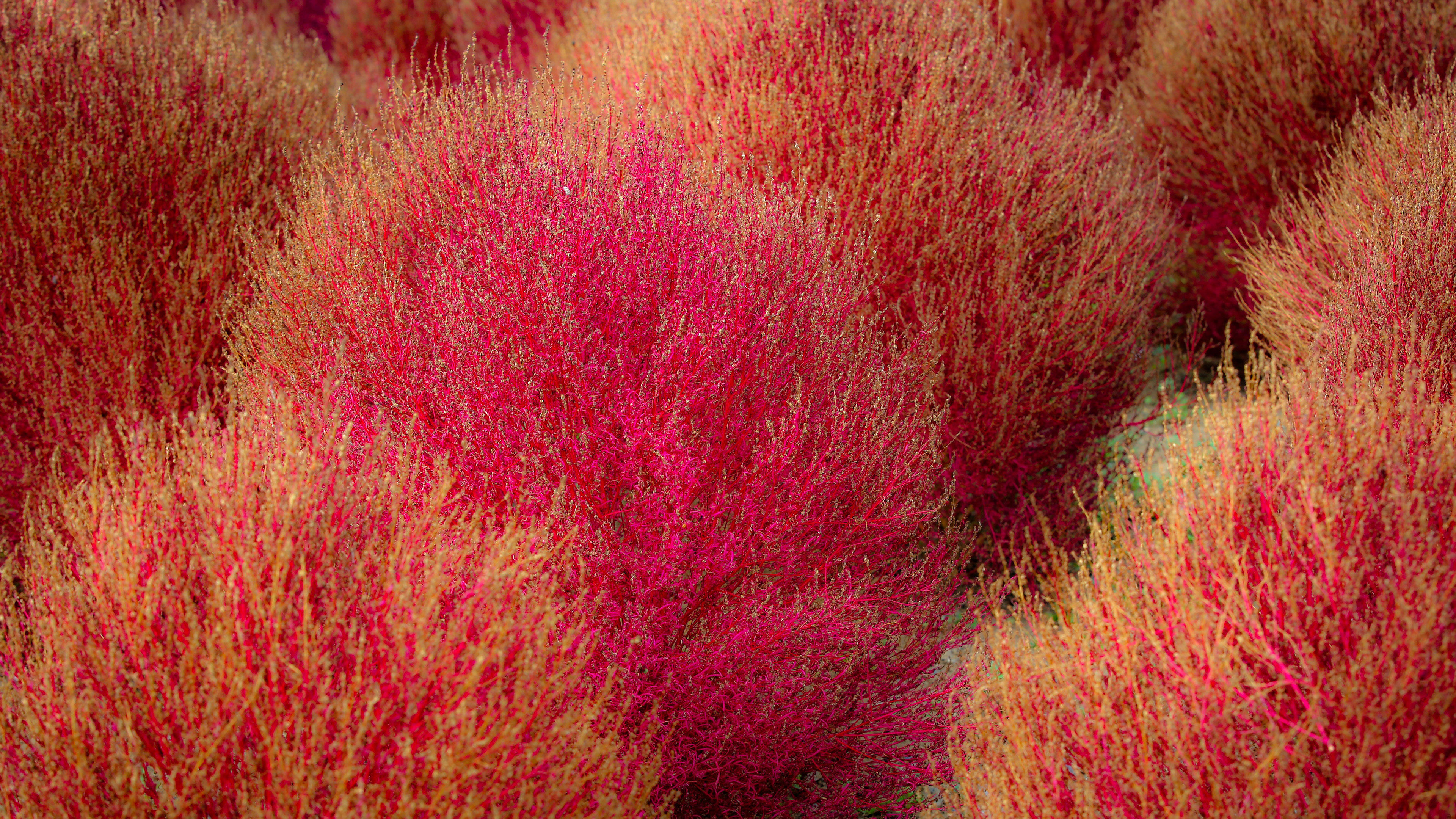 A vibrant 4K wallpaper showcasing a dense field of Kochia bushes in their spectacular fall colors across Ibaraki, Japan. The bushes display a rich spectrum from deep fuchsia to fiery reddish-orange, creating a soft, undulating texture that radiates warmth and seasonal beauty.