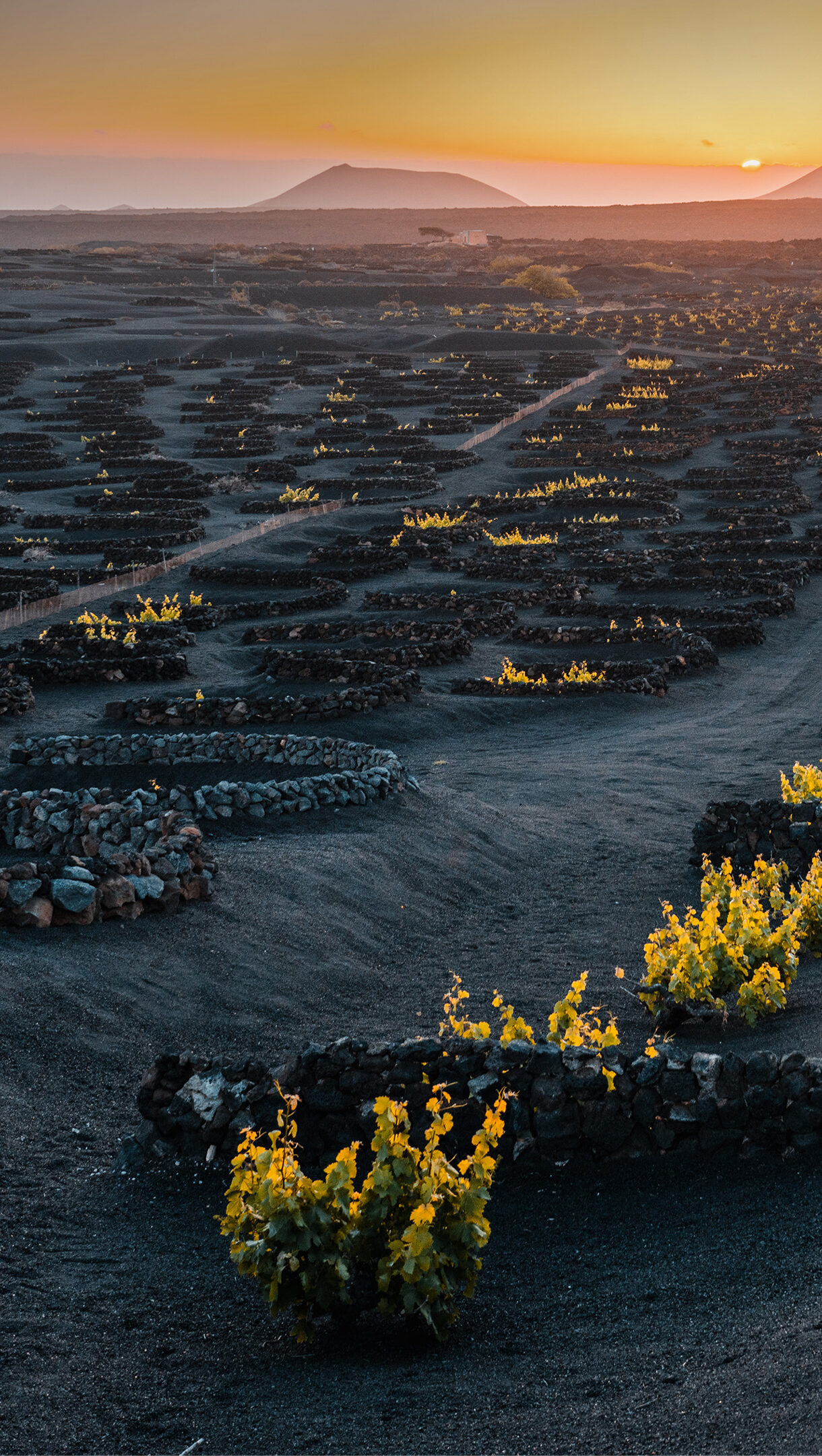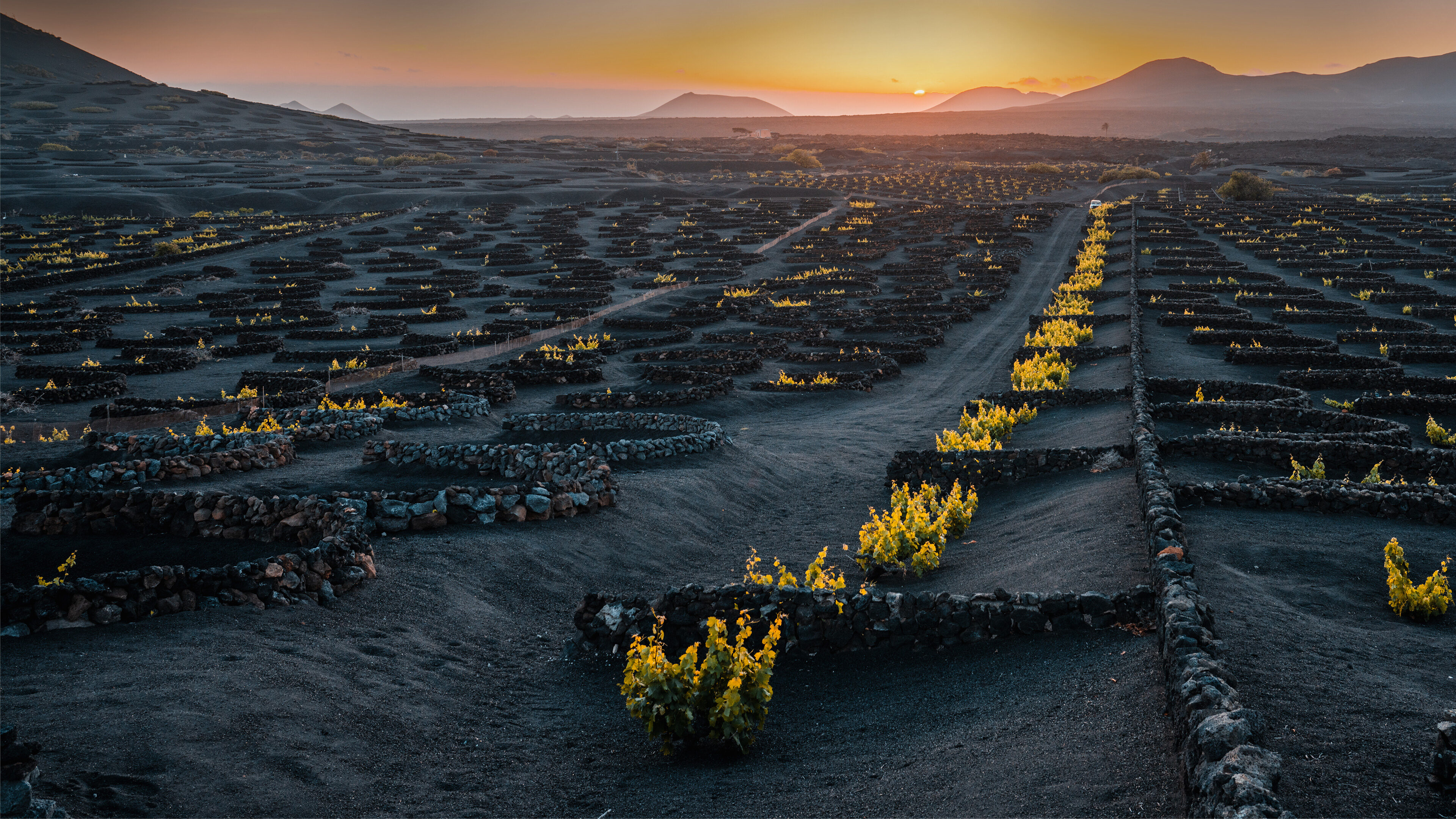 A breathtaking 4K wallpaper of La Geria’s unique volcanic vineyards on Lanzarote, stretching across undulating black ash fields. The setting sun bathes the horizon in warm orange and pink, beautifully illuminating the vibrant green grapevines nestled within their protective stone circles against the dark volcanic landscape.