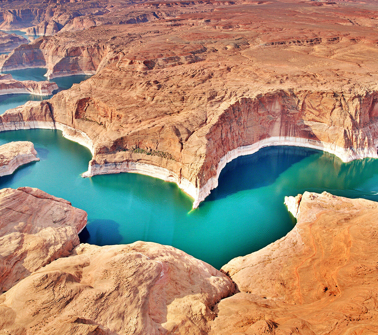 An expansive 4K wallpaper capturing the aerial view of Lake Powell, where the vibrant turquoise Colorado River dramatically winds through vast, stratified sandstone canyons. The striking contrast between the brilliant water and the rugged, sun-baked walls, highlighted by pale erosion lines, creates a majestic and serene natural spectacle.