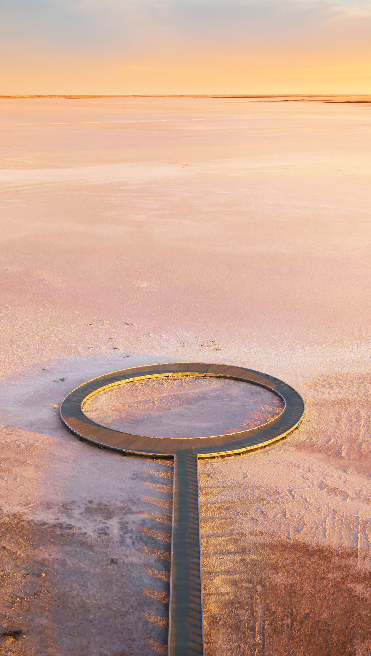 A magical 4K wallpaper of Lake Tyrrell, Victoria, Australia, depicts a vast, reflective pink salt lake under a sunset sky, with a modern boardwalk extending into its expanse. The interplay of golden light and pastel pink hues creates an ethereal landscape, culminating in the striking circular viewing platform at the boardwalk's end.