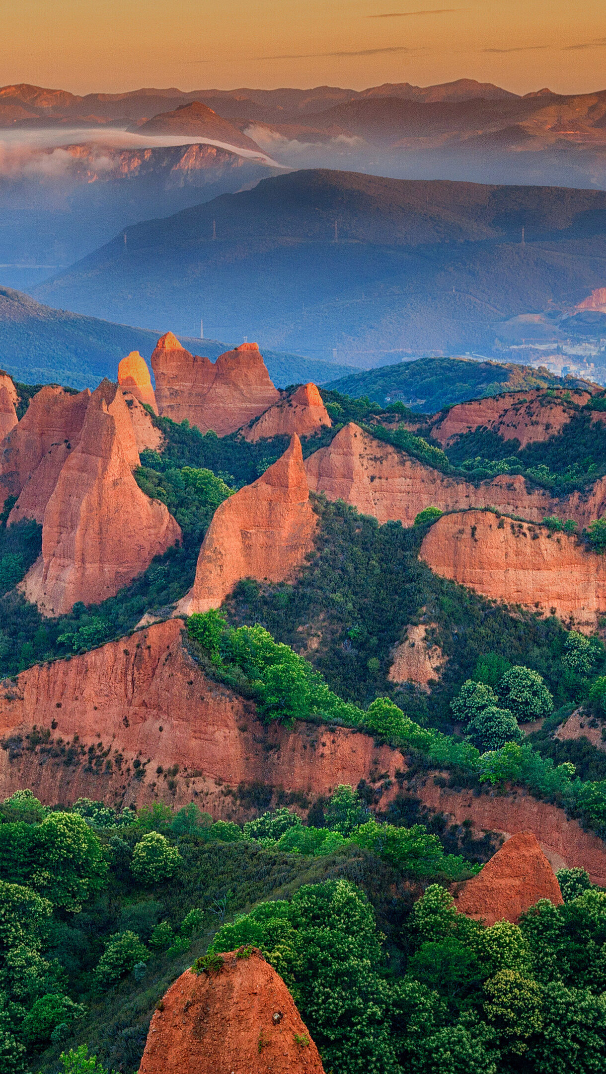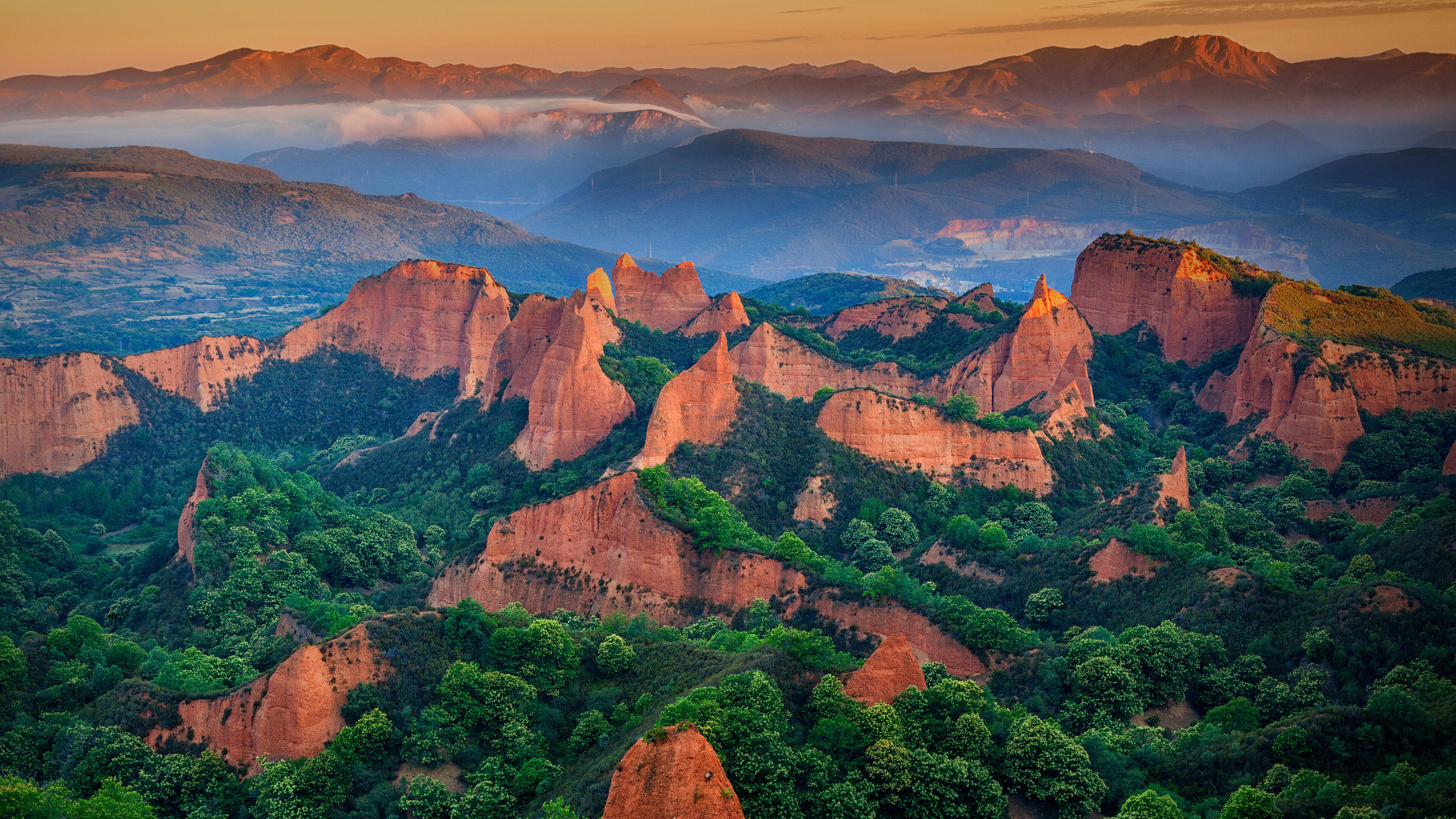 A magnificent 4K wallpaper showcases the ancient Roman gold mine landscape of Las Médulas in Spain, characterized by its dramatically eroded reddish-orange peaks rising above verdant valleys. Golden light illuminates the striking red rock formations and lush green trees, creating a breathtaking contrast against the layers of hazy blue mountains under a warm, orange sky.