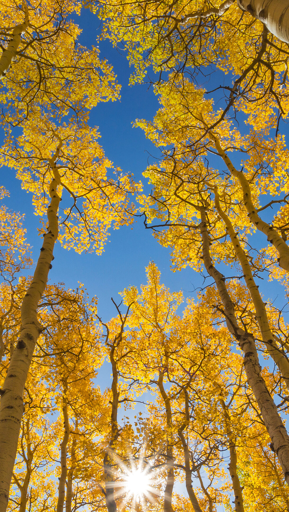 A radiant 4K wallpaper presenting a view looking up through tall Aspen trees vibrant with golden fall foliage along Last Dollar Road. A brilliant sunburst pierces through the yellow leaves, contrasting sharply with the deep blue sky and illuminating the pale tree trunks.