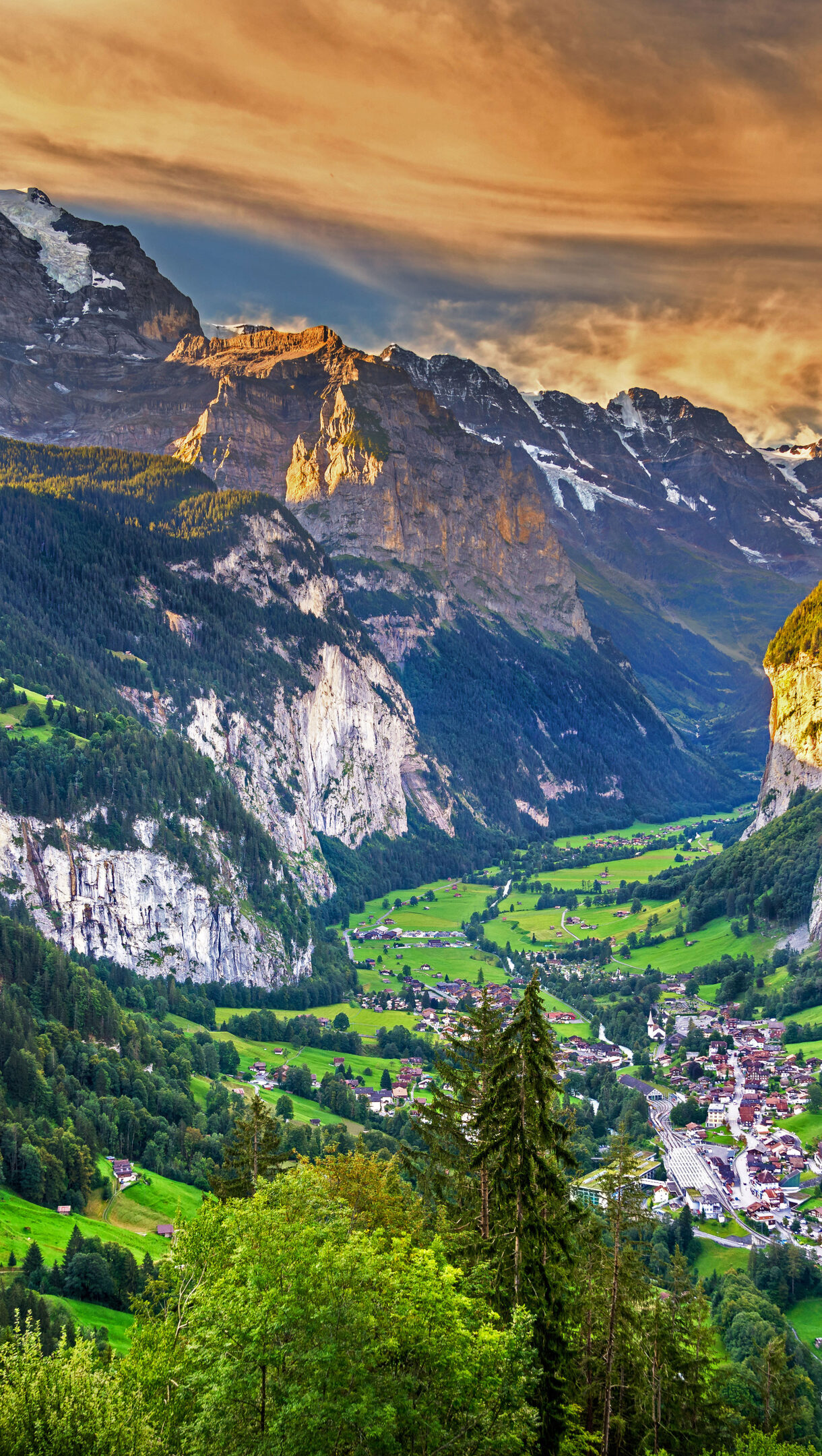 A breathtaking 4K wallpaper capturing the expansive Lauterbrunnen Valley in the Swiss Alps, where a charming mountain village is nestled amidst lush greenery. The warm glow of the sunset illuminates the dramatic snow-capped peaks and the distinctive rock faces, creating a serene and majestic mood.