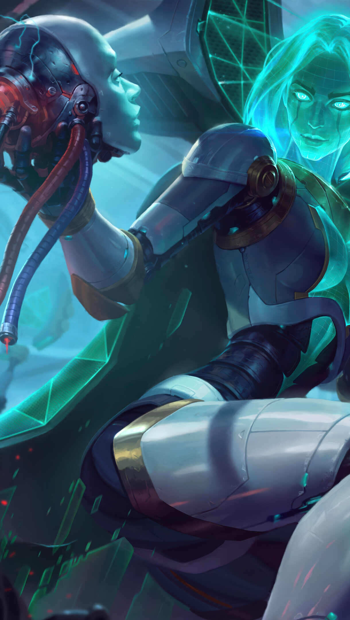 A futuristic 4K wallpaper depicting Leblanc in her Program Skin Rework, a cybernetic sorceress, poised dynamically within a dimly lit, high-tech laboratory. Her glowing cyan, wireframe form, particularly her holographic face and hair, intensely contrasts with the dark, industrial surroundings, as she holds a detached robotic head with glowing red wires.