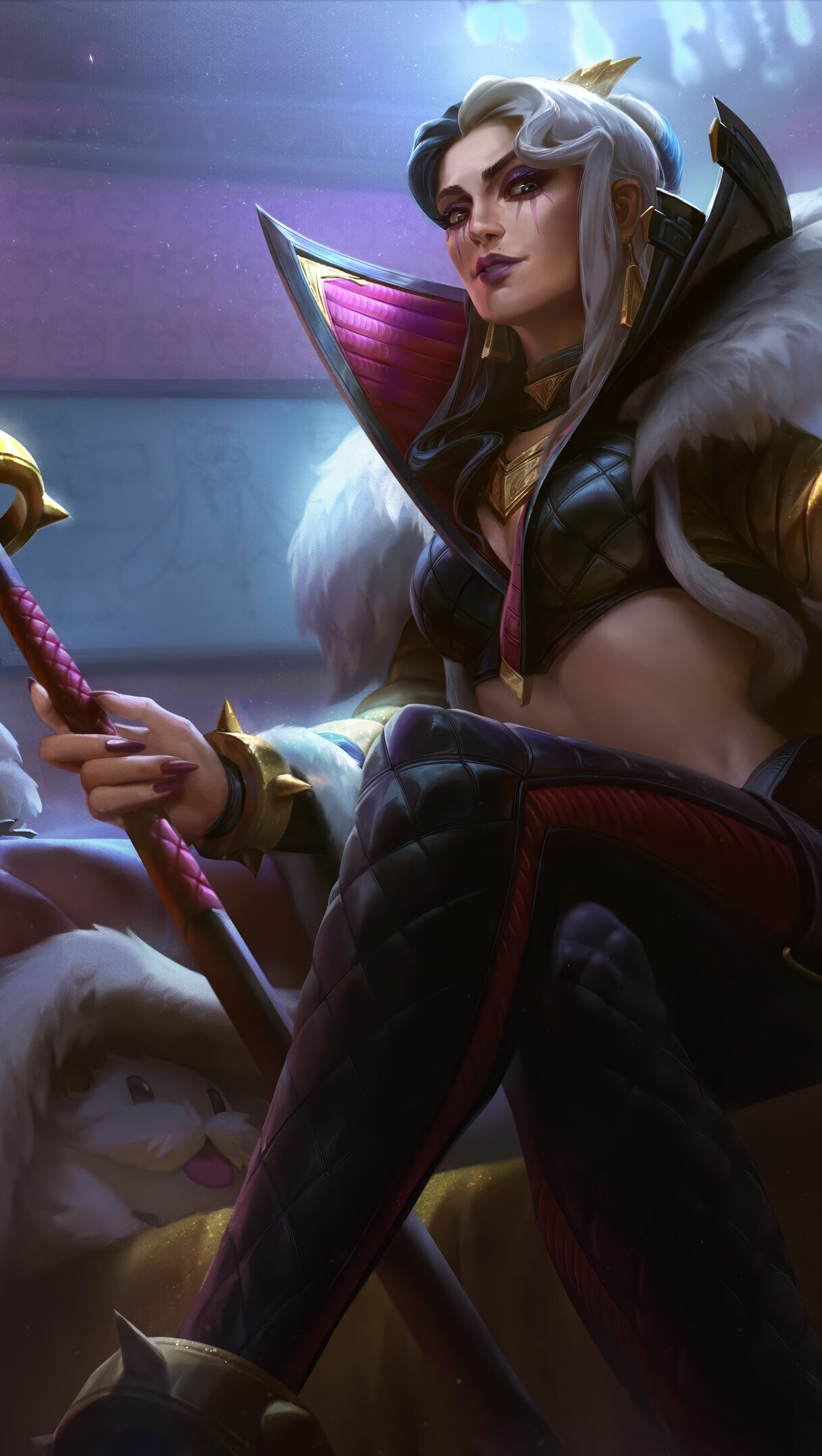 A mischievous 4K wallpaper featuring LeBlanc in her Wicked skin, lounging confidently in a lavish, dimly lit room with several playful Poros. Her sly expression and the vibrant purple glow from her staff and a floating Poro Snax create a striking contrast with the soft, white Poros, emphasizing her elegant and playfully wicked demeanor.