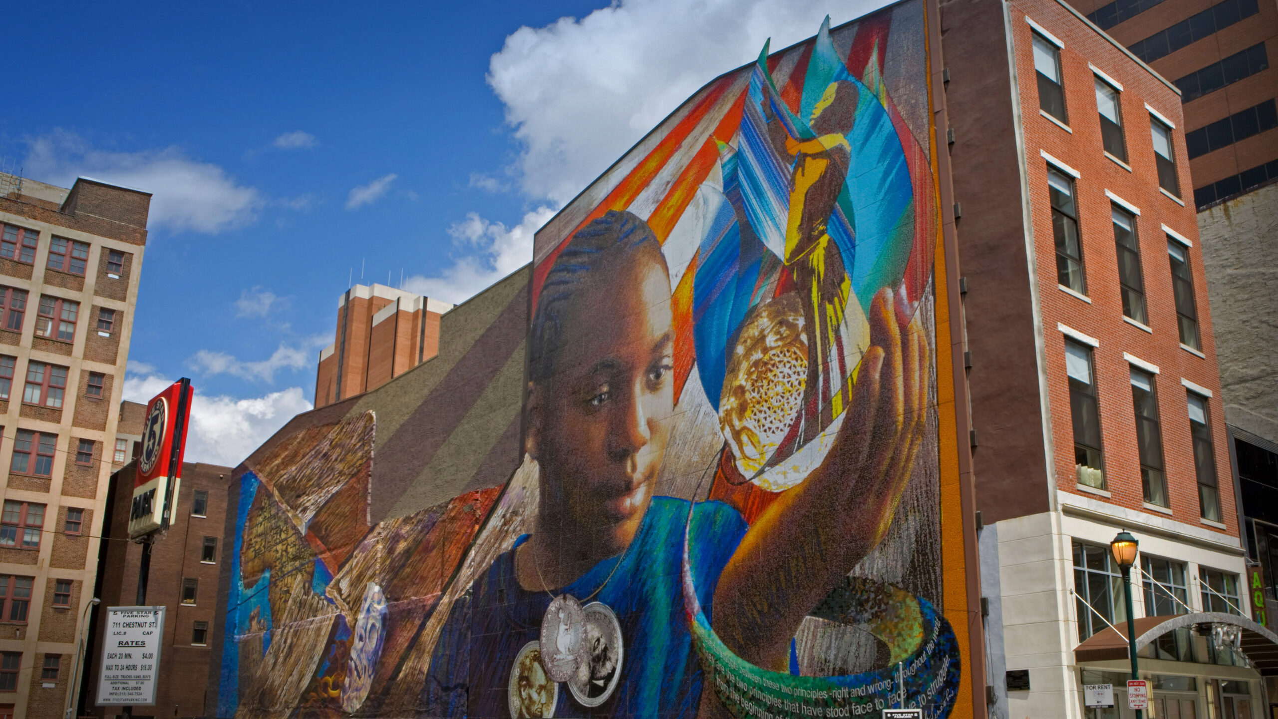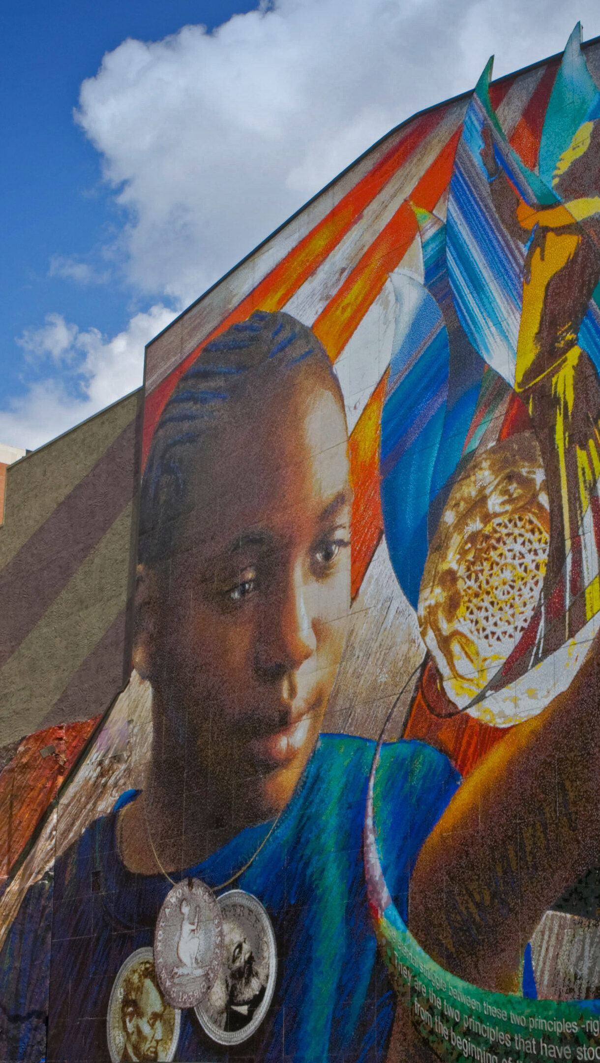 A powerful 4K wallpaper showcases the Legacy Mural by Josh Sarantitis and Eric Okdeh, an expansive street art piece on an urban building under a bright blue sky. The young person's introspective gaze and the intricate details of historical coins and interwoven vibrant patterns create a rich tapestry reflecting themes of heritage and future.