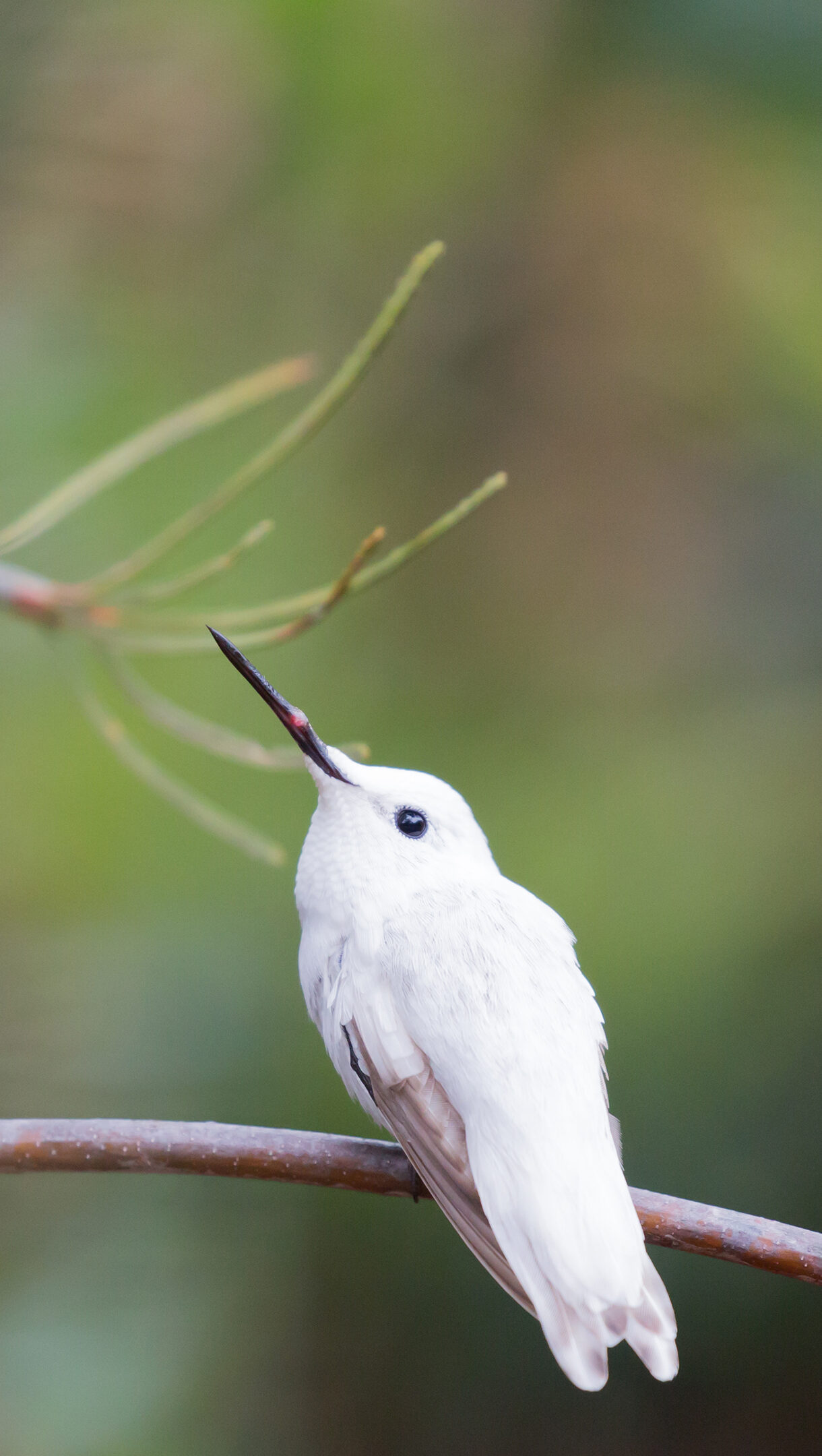 Unveiling a 4K wallpaper with a serene view of a Leucistic Anna's Hummingbird perched calmly in an Australian garden. Its striking pure white plumage and dark eye create a luminous focal point against the softly blurred green foliage as it gazes intently upwards.