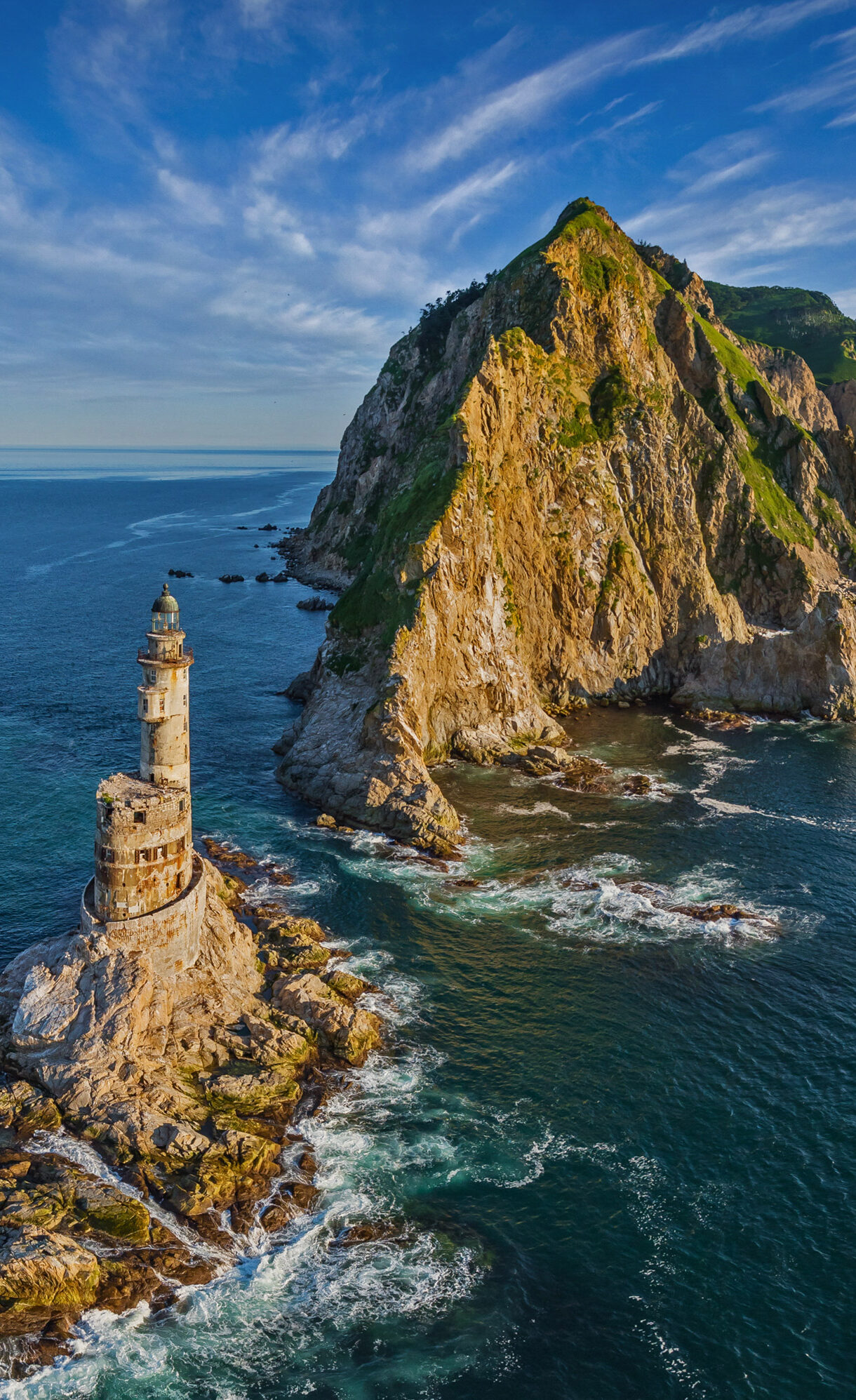 A dramatic 4K wallpaper presents the iconic Lighthouse at Cape Aniva, Sakhalin Island, Russia, standing on a rugged rocky islet in the expansive ocean. Golden sunlight illuminates the lighthouse's aged, decaying structure and the colossal, green-topped cliffs behind it, creating a powerful sense of isolated majesty against the deep blue, foam-laced sea.