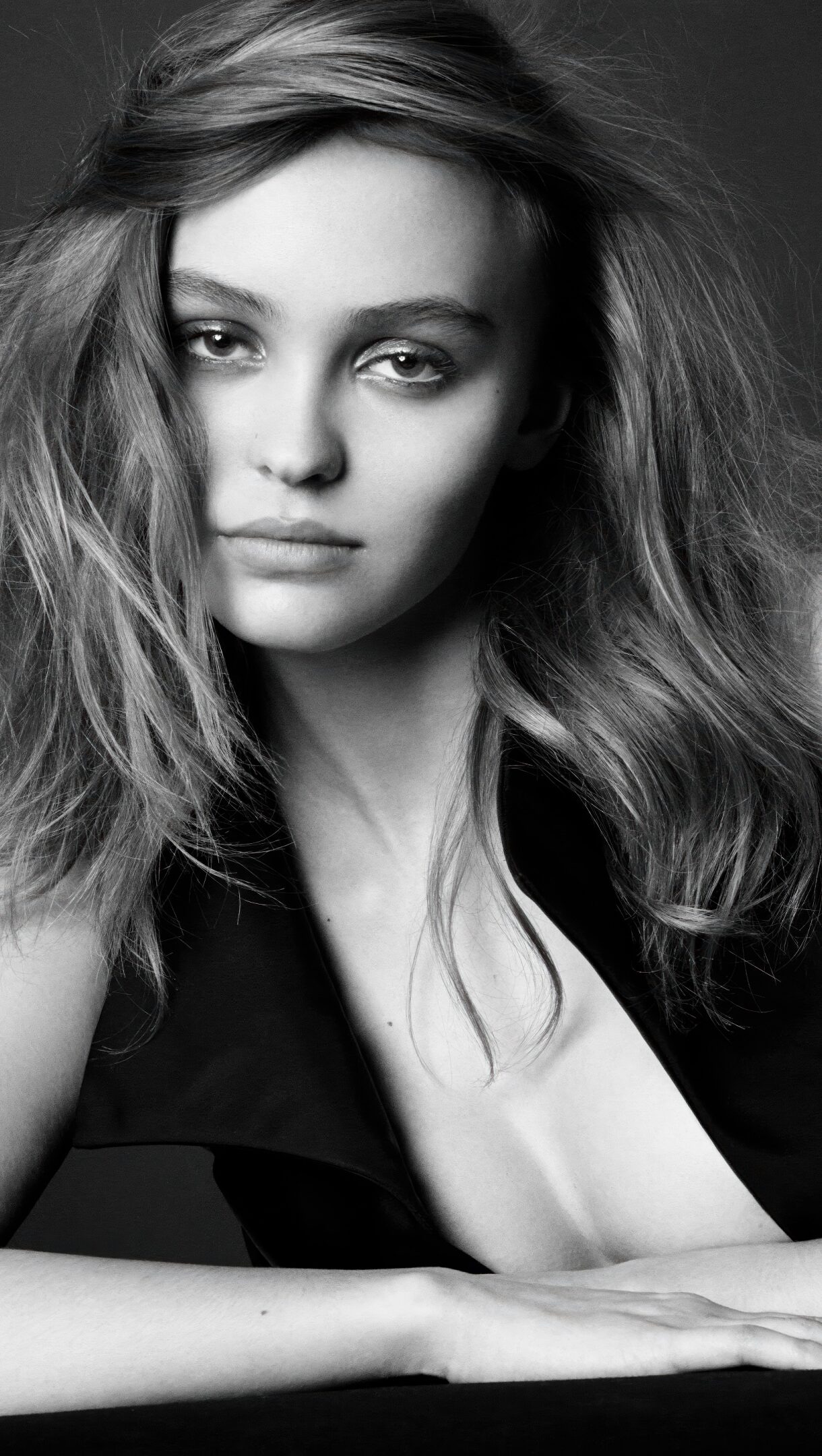 An intimate 4K wallpaper capturing a black and white portrait of Lily Rose Depp leaning forward with a dark, minimalist background. Her intense, direct gaze and subtly windblown hair are illuminated by soft lighting, emphasizing the dramatic contrast of the monochrome palette.