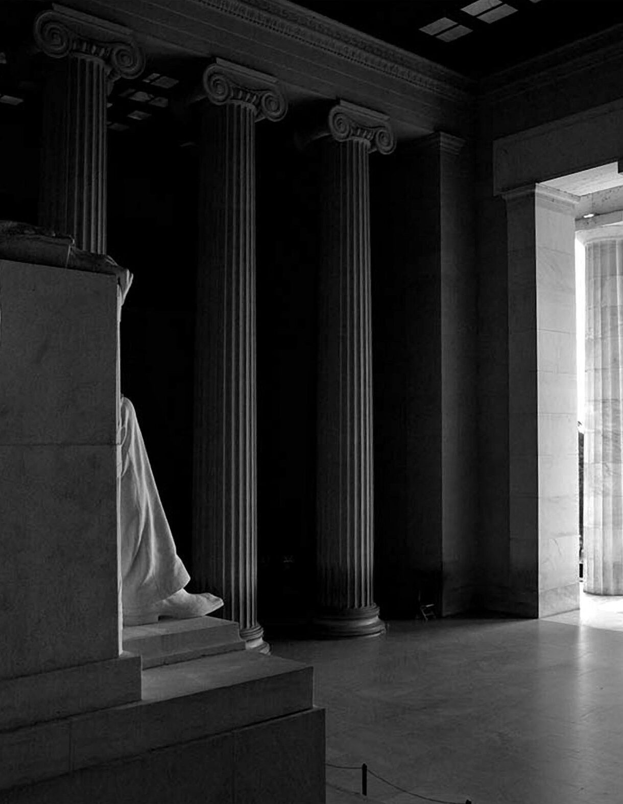 A profound 4K wallpaper featuring the colossal seated statue of Abraham Lincoln inside the grand, columned hall of the Lincoln Memorial in Washington D.C. The grayscale composition emphasizes the stark contrast between the statue's contemplative shadows and the brilliant light streaming through the massive exterior columns, drawing small silhouetted figures towards the entrance.