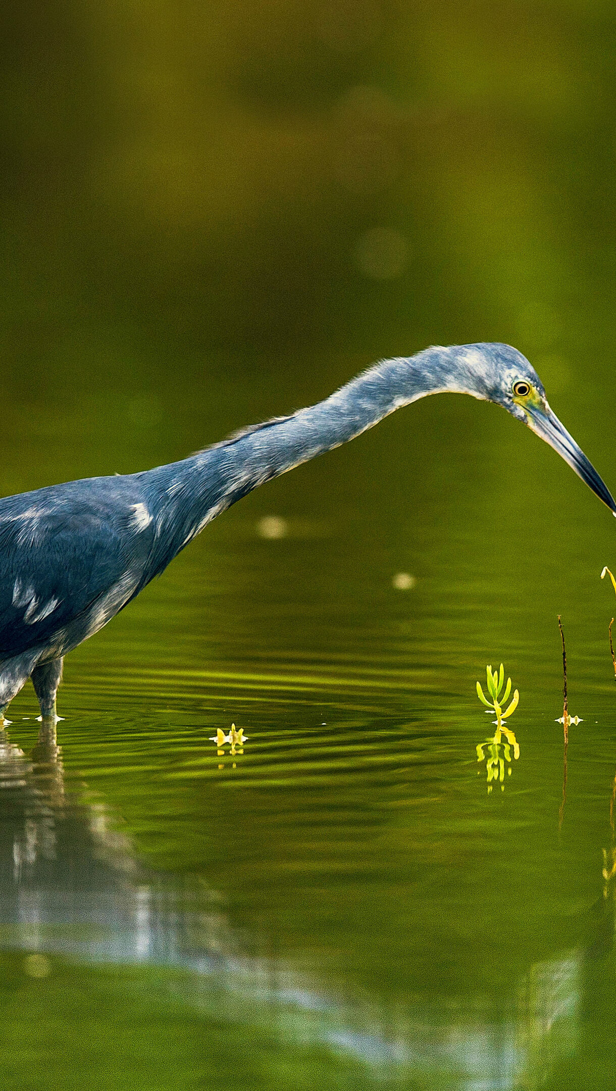 A vibrant 4K wallpaper showcasing a Little Blue Heron wading gracefully in the tranquil green waters of Cuba. Its distinctive blue-grey plumage contrasts sharply with the luminous emerald surface, as the bird intently observes small golden-yellow aquatic plants, creating a serene and captivating scene.