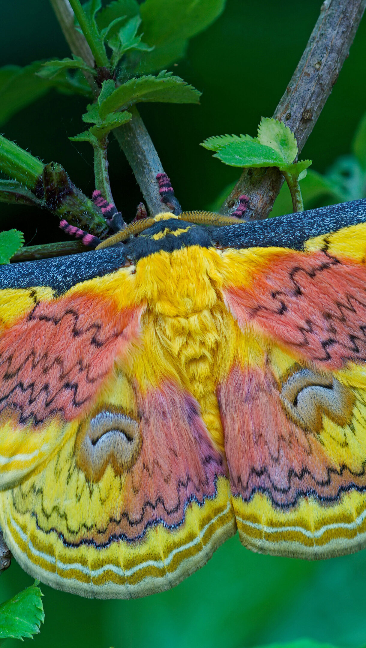 A brilliant 4K wallpaper displaying a magnificent Loepa Oberthuri Moth perched on a green plant stem, surrounded by soft green foliage. The moth's expansive yellow and pink wings are adorned with intricate wavy patterns and distinctive eye-like markings, creating a vivid and enchanting contrast against the natural green setting.