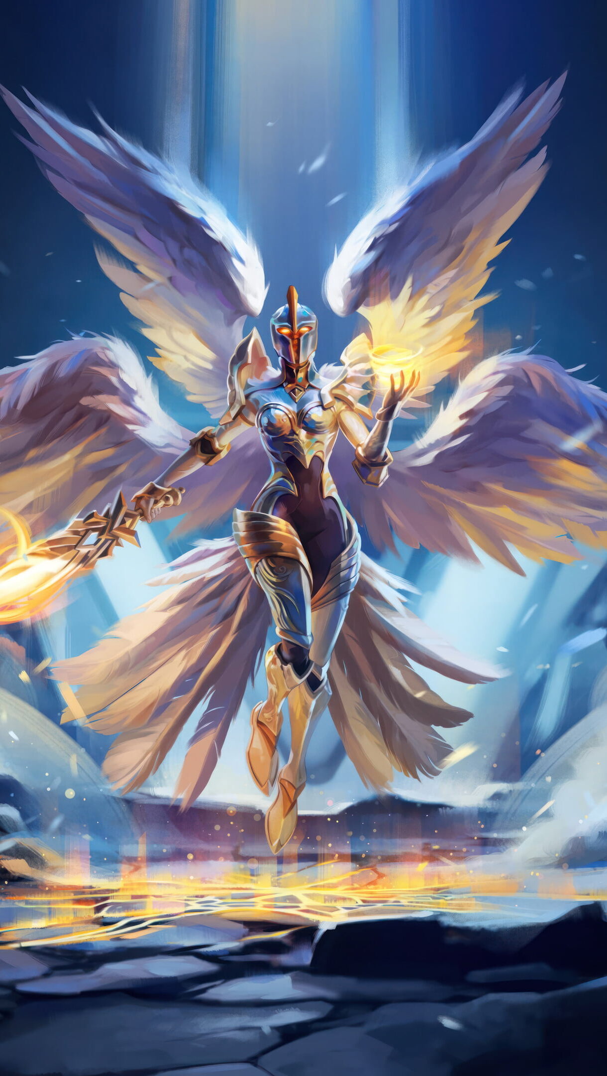 A breathtaking 4K wallpaper showcasing the majestic LoL Worlds Kayle skin, highlighting Kayle, the Righteous, radiating celestial power in the epic world of League of Legends. Simply click the download button to bring this masterpiece to life on your screen as a desktop wallpaper or save it for later in your picture collection.