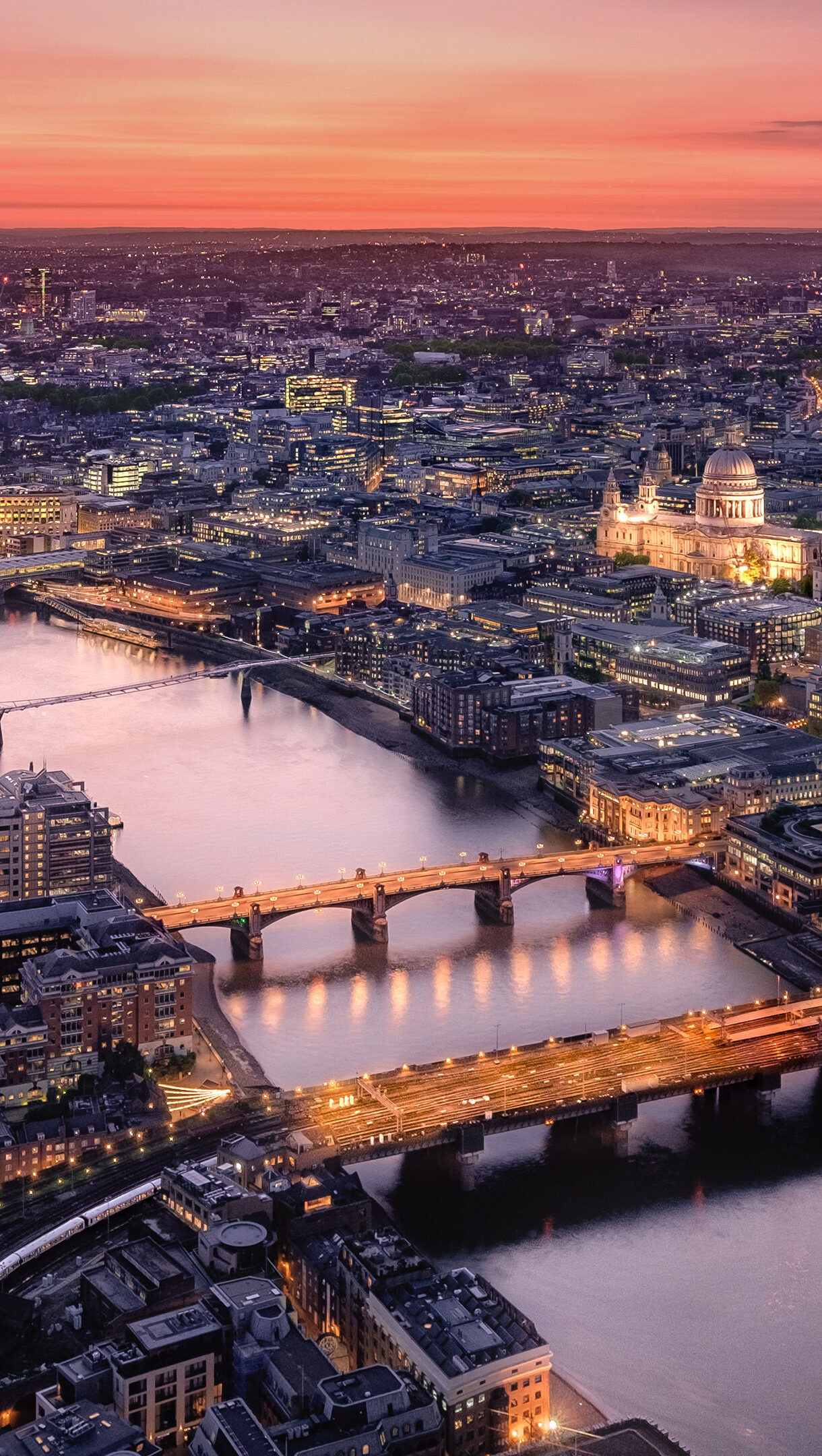 A breathtaking 4K wallpaper captures an aerial view of the bustling London cityscape at sunset, with the River Thames winding majestically through its illuminated heart. The vibrant orange and pink sky beautifully reflects on the river's surface, while countless city lights begin to sparkle, creating a serene yet energetic urban glow.