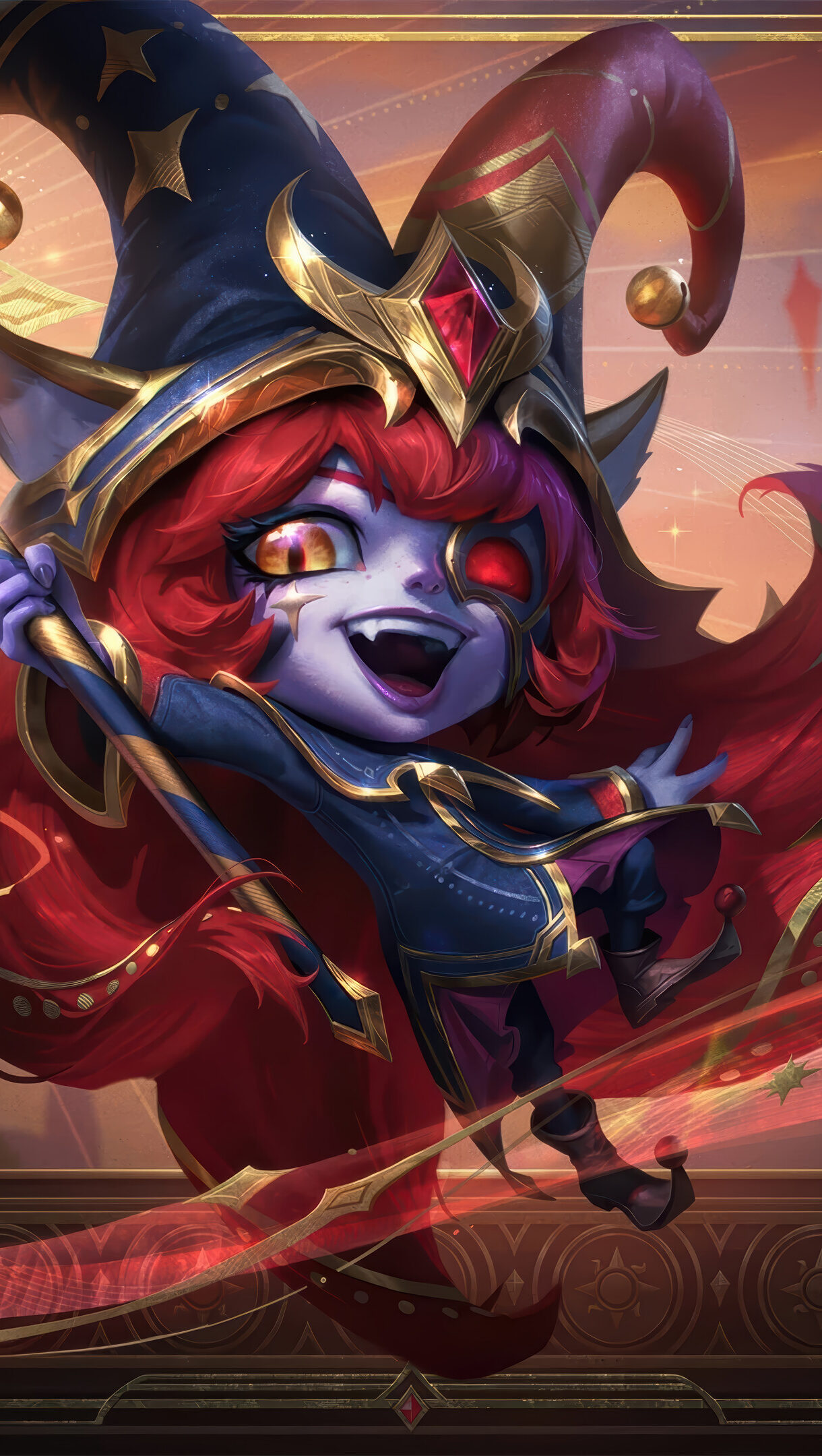 A mystical 4K wallpaper showcasing Lulu in her Arcana skin, a small, red-haired character with glowing yellow eyes and a wide grin, adorned in a jester-witch hat and dark, elegant clothing, dynamically posed amidst swirling red and gold arcane energy. Her gleefully mischievous expression, highlighted by the staff's golden glow, establishes a mood of captivating, potent magic within an ornate, dark carnival setting.