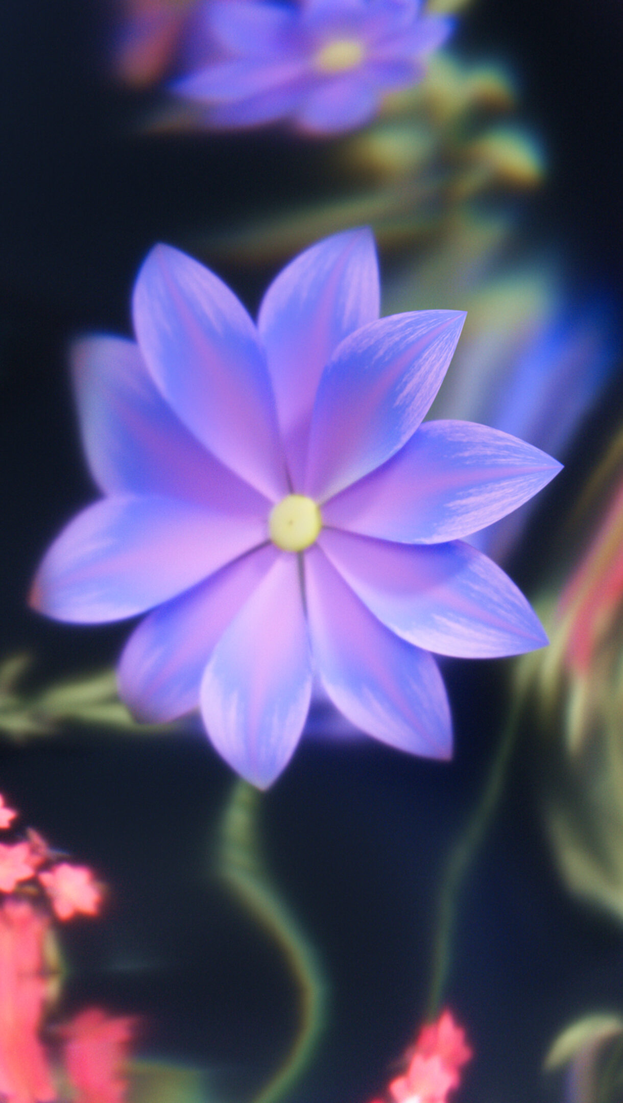 A magical 4K wallpaper of a vibrant purple flower with a bright yellow center, surrounded by ethereal, glowing floral shapes and luminous streaks against a deep blue-black background. The striking visual is the way the light refracts and smears, transforming the vibrant pink and purple blossoms into swirling, dreamlike patterns of color and energy.