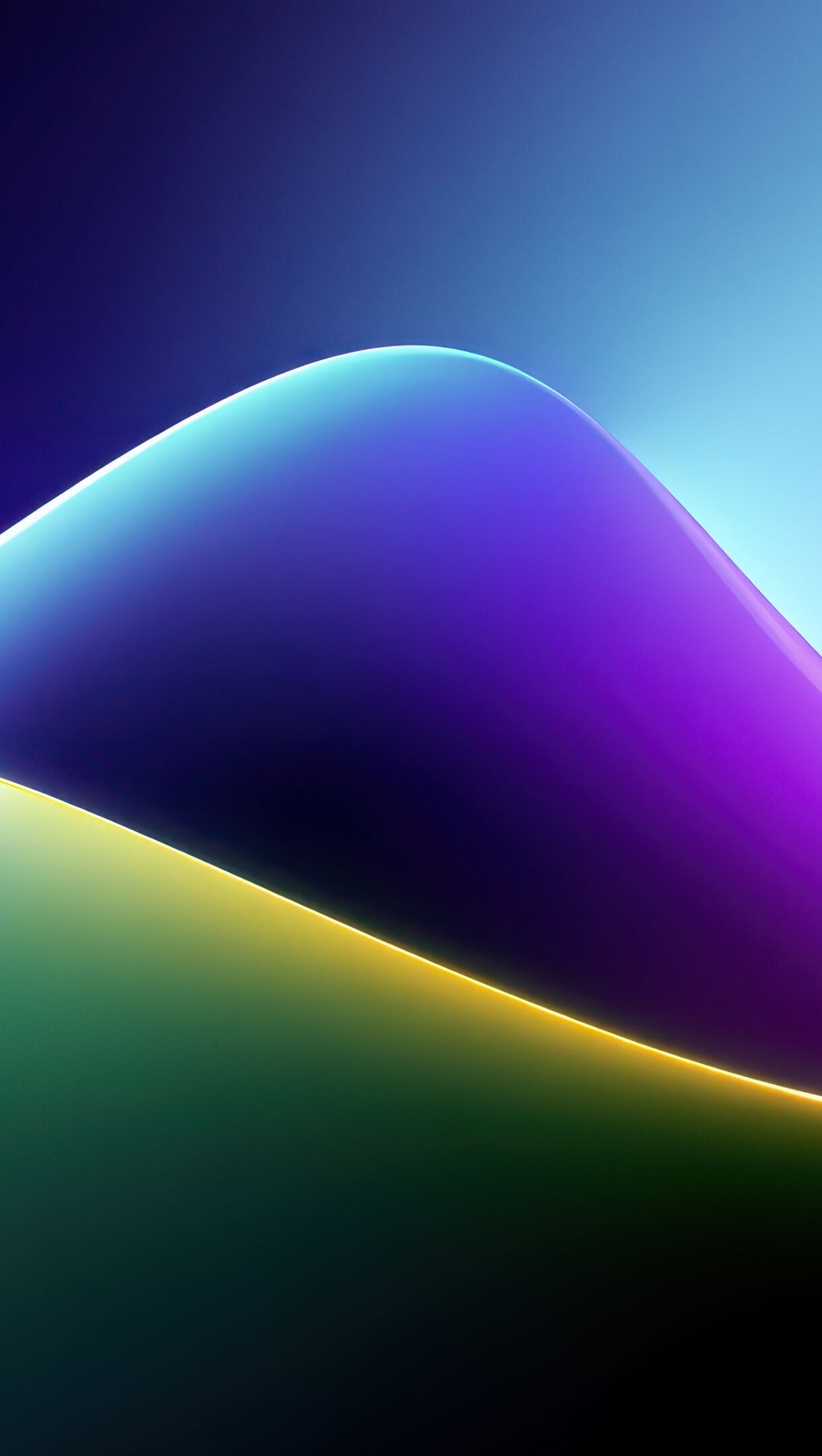 A vibrant 4K wallpaper showcasing smooth, flowing abstract light curves across a dark, gradient background. Luminous edges define sweeping waves of gradient color, from electric blue and purple to glowing yellow and deep green, creating a dynamic and serene abstract composition.