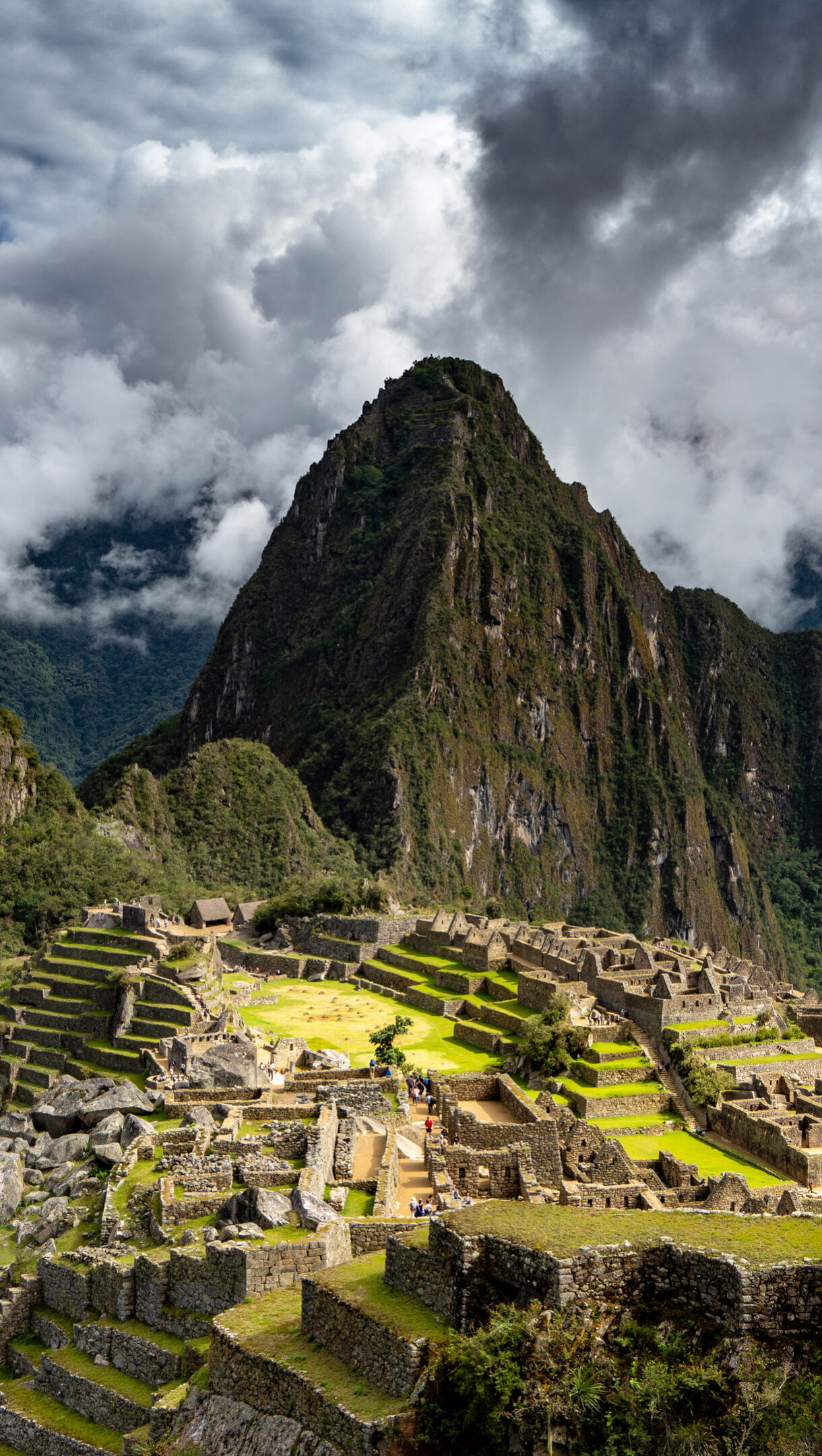 A breathtaking 4K wallpaper of the ancient city of Machu Picchu, nestled high in the Peruvian Andes Mountains. Dramatic clouds partially obscure the towering, jungle-clad peaks, while sunlight highlights the intricate stonework and verdant terraces of the ancient city, evoking a sense of timeless wonder.
