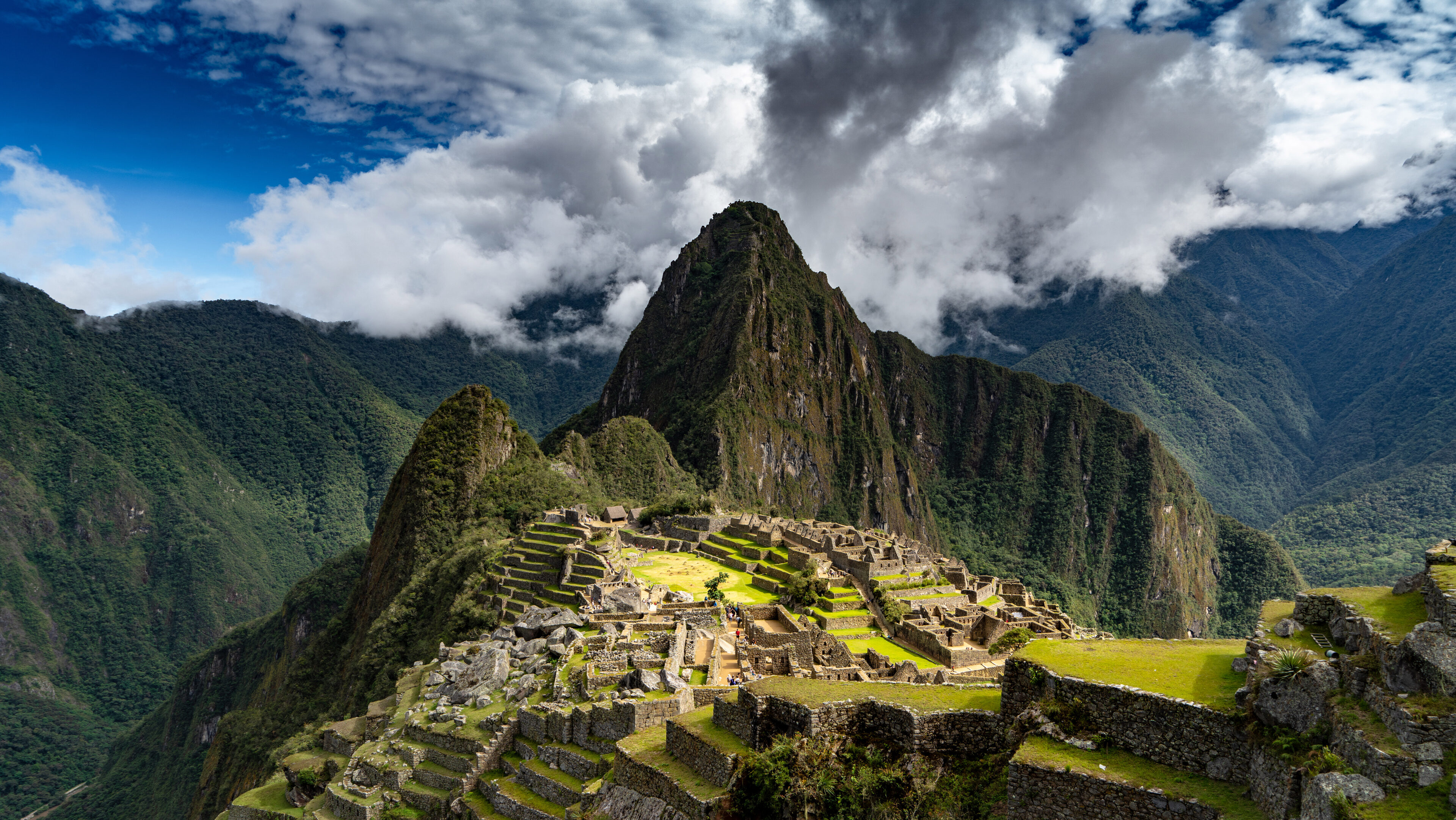 A breathtaking 4K wallpaper of the ancient city of Machu Picchu, nestled high in the Peruvian Andes Mountains. Dramatic clouds partially obscure the towering, jungle-clad peaks, while sunlight highlights the intricate stonework and verdant terraces of the ancient city, evoking a sense of timeless wonder.