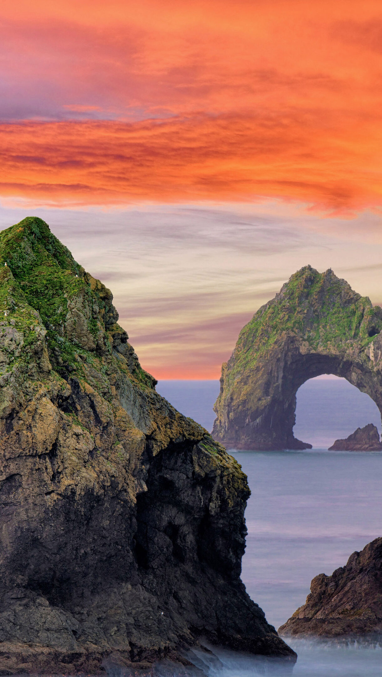 This breathtaking 4K wallpaper presents Mack Arch Rock and other rugged sea stacks rising from the Pacific Ocean along the Southern Oregon Coast at sunrise. The fiery orange and pink hues of the sunrise illuminate the dramatic sky, casting a mystical glow over the ancient, moss-covered rock formations and the gentle, misty ocean waves.