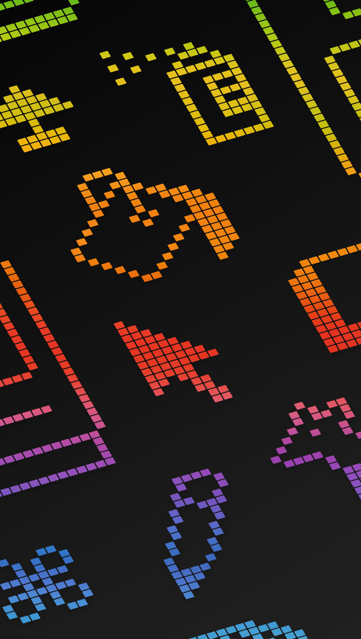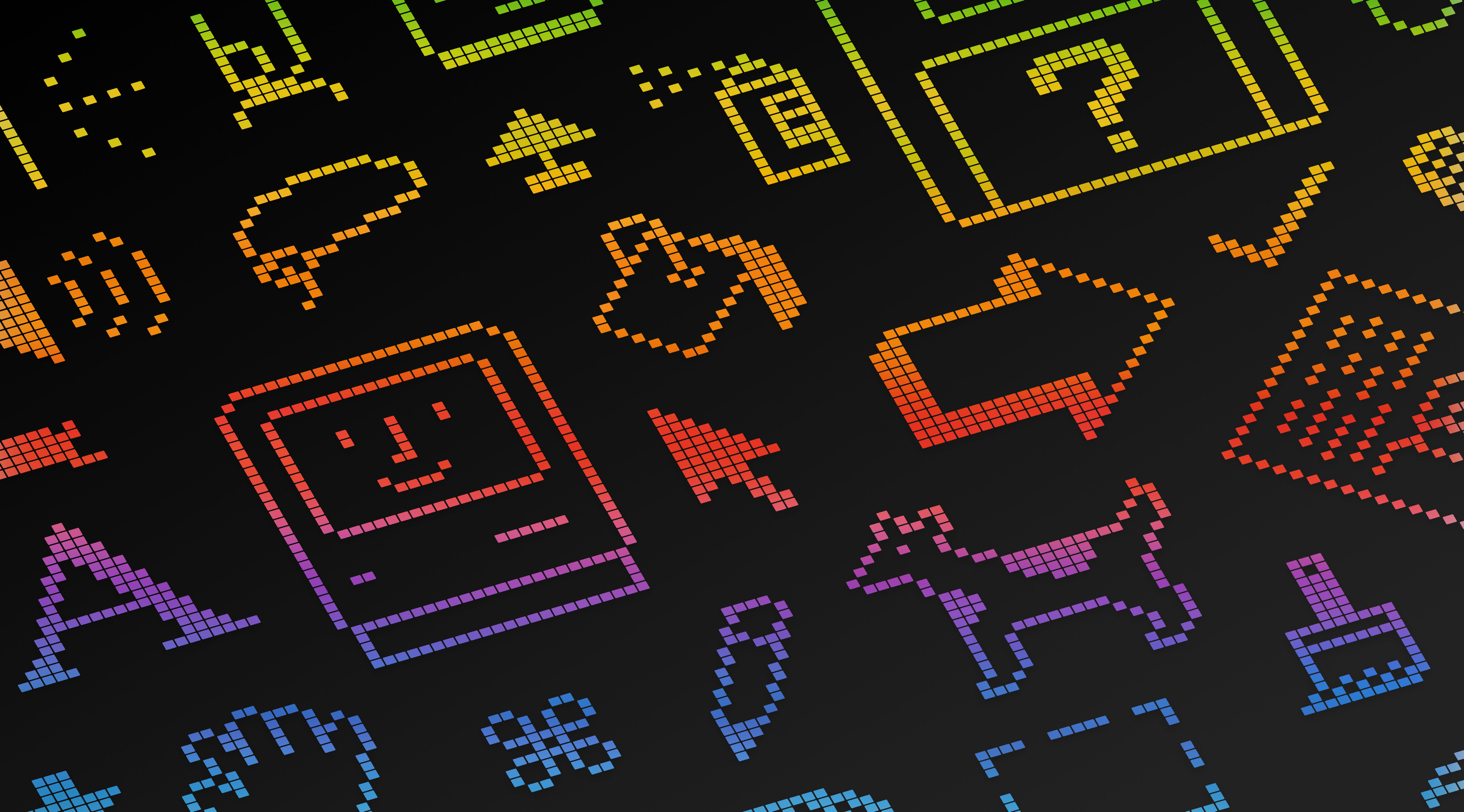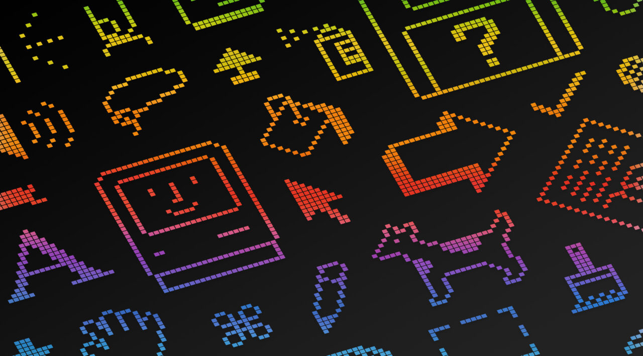 A nostalgic 4K wallpaper displaying a dense, dark theme pattern of classic macOS pixel icons rendered as vibrant digital art. These retro symbols, including the happy Mac and various cursor tools, glow with a gradient rainbow palette against the deep black, evoking a playful yet sophisticated technological homage to macOS Sequoia.