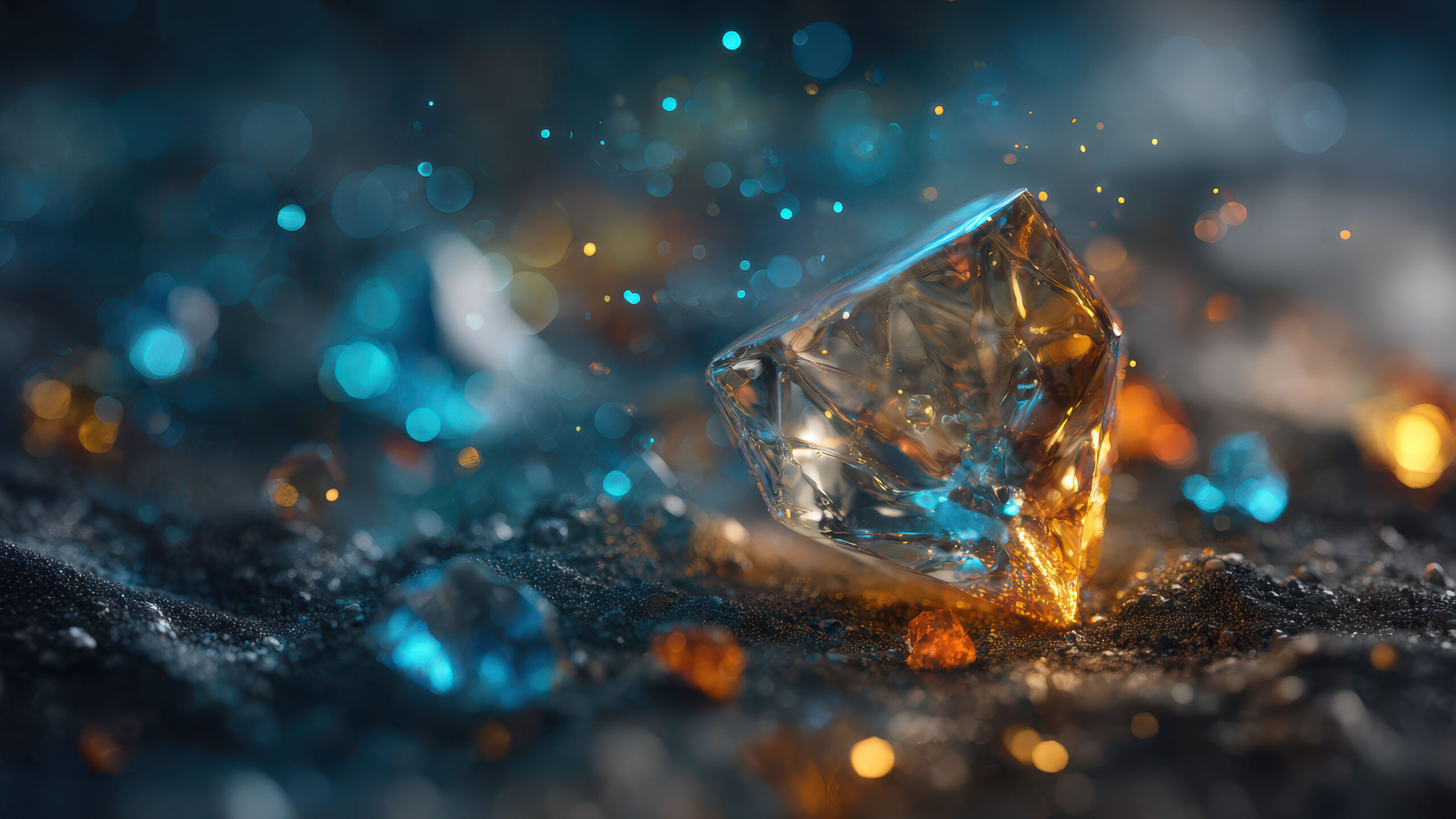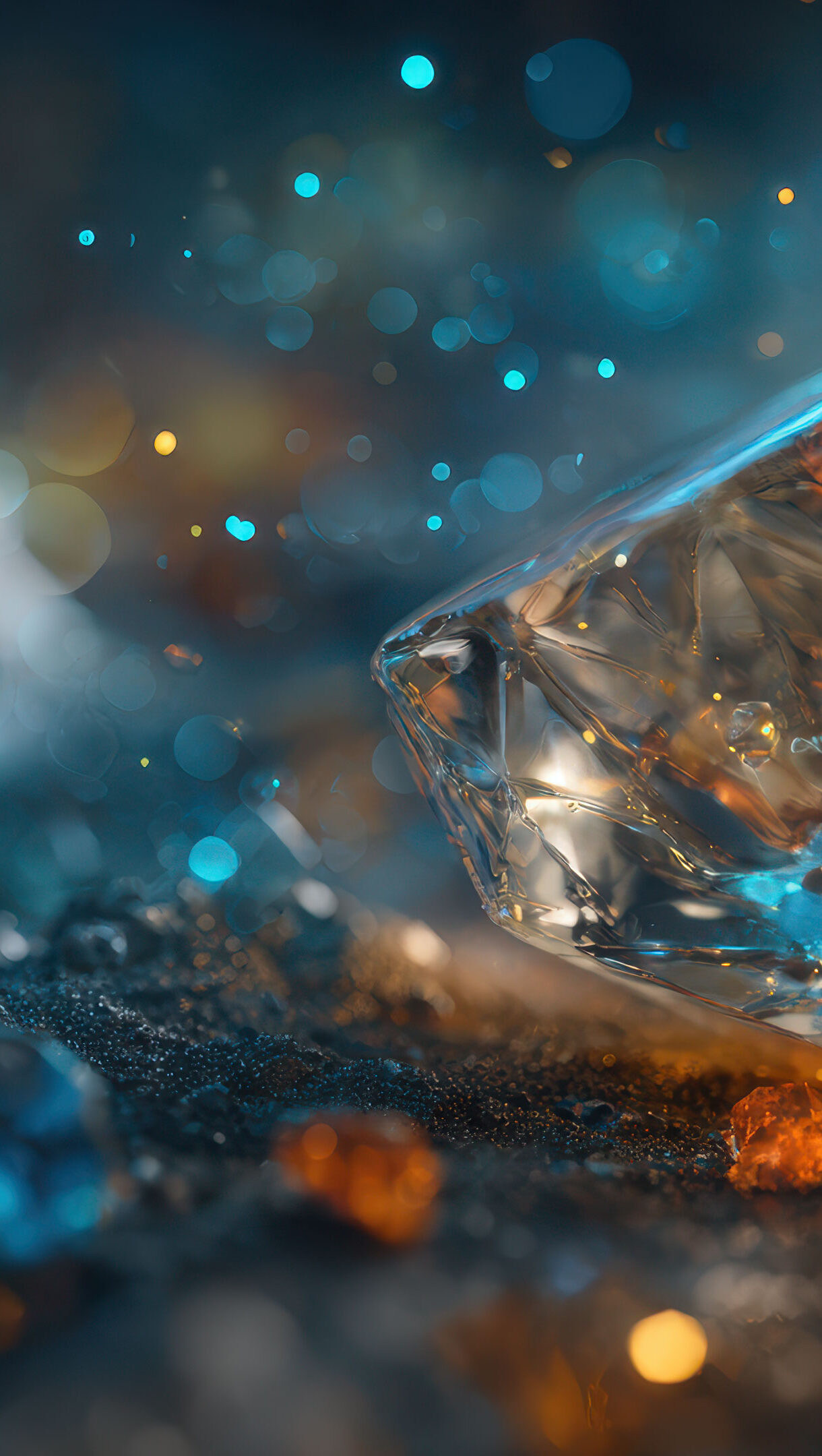 A captivating 4K wallpaper features a macro shot of a luminous, faceted crystal set against a dark, granular ground. The crystal emanates warm orange and cool blue light, mirroring the abundant, shimmering bokeh that fills the background.