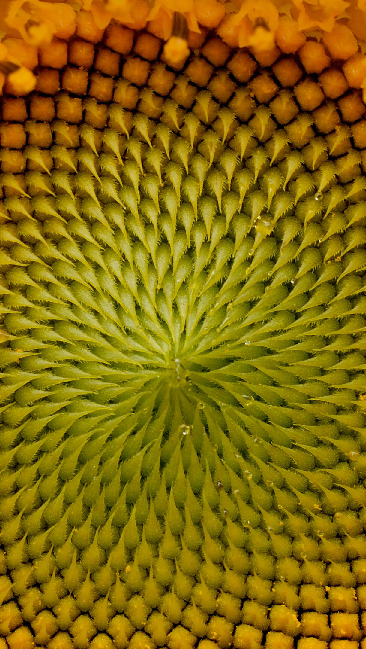 A captivating 4K wallpaper revealing the intricate macro view of a sunflower's vibrant center. Its tightly packed florets brilliantly display the mathematical Fibonacci spiral, transitioning from soft green in the middle to golden orange at the edges, framed by warm yellow petals.