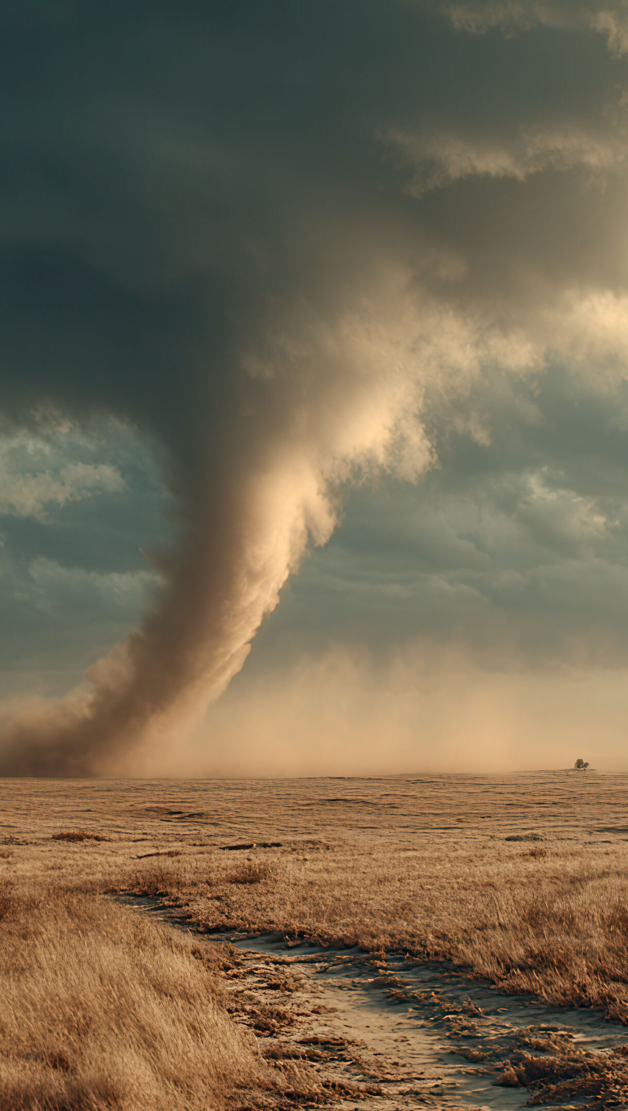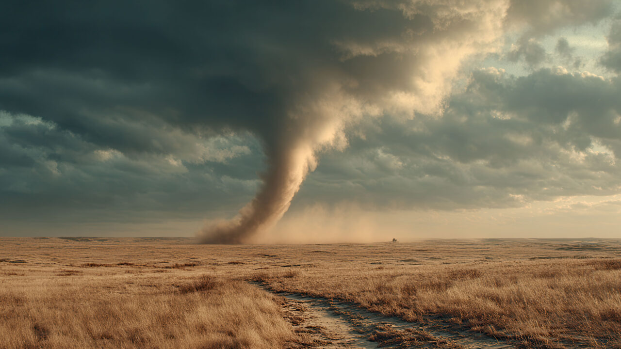 An awe-inspiring 4K wallpaper captures a massive dust devil spinning across a vast, sun-kissed prairie under a dramatic, cloud-filled sky. Golden sunlight spectacularly illuminates the towering vortex of dust and the dry, golden grass, creating a breathtaking contrast against the heavy, dark storm clouds overhead.