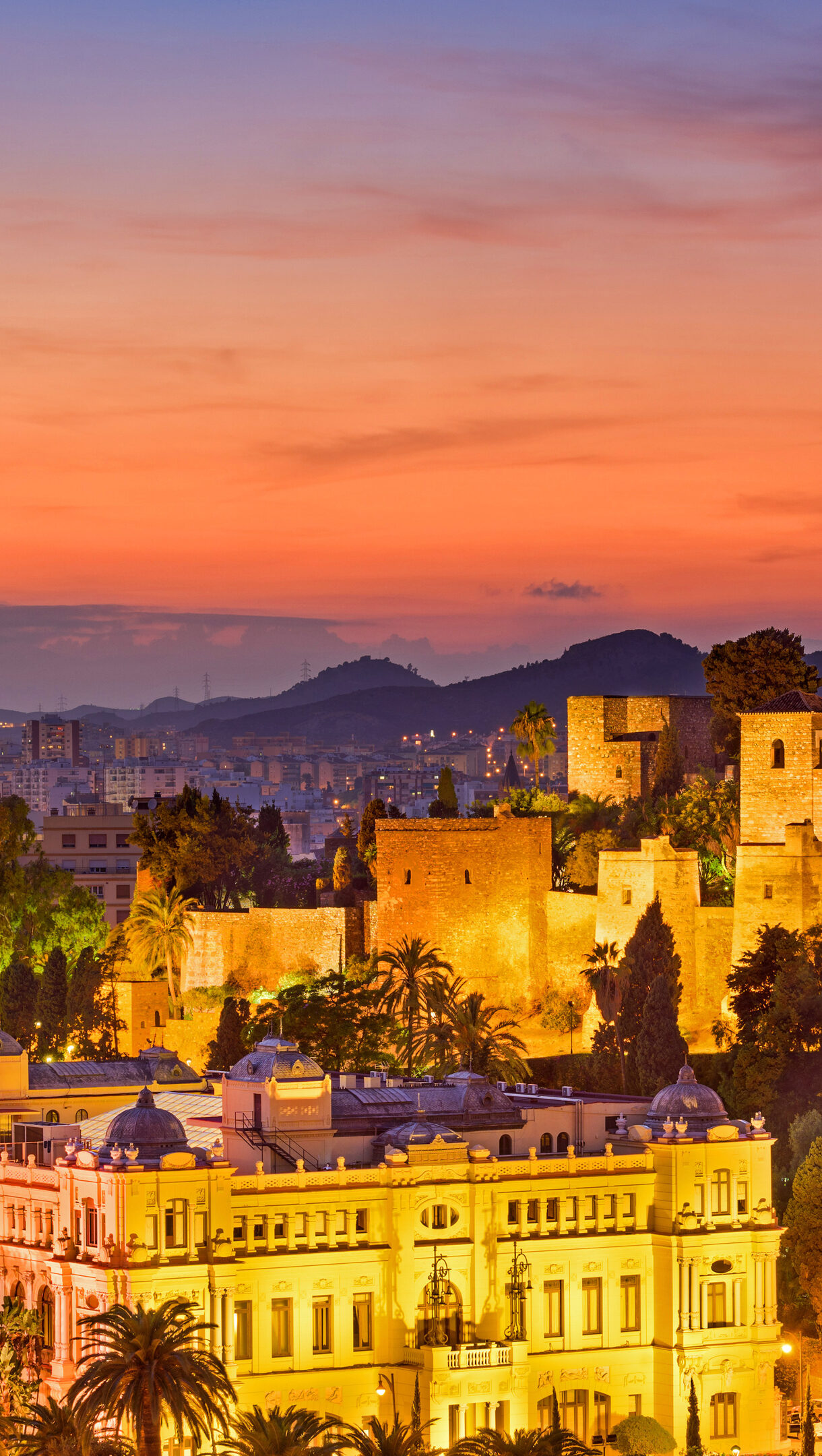 A captivating 4K wallpaper showcases Málaga Old Town's sprawling cityscape in Spain, highlighting the majestic Alcazaba and Cathedral at sunset. The ancient Alcazaba and the Cathedral glow with warm golden light against a dramatic twilight sky, painted in rich hues of orange, pink, and soft purple, creating a serene and majestic atmosphere.