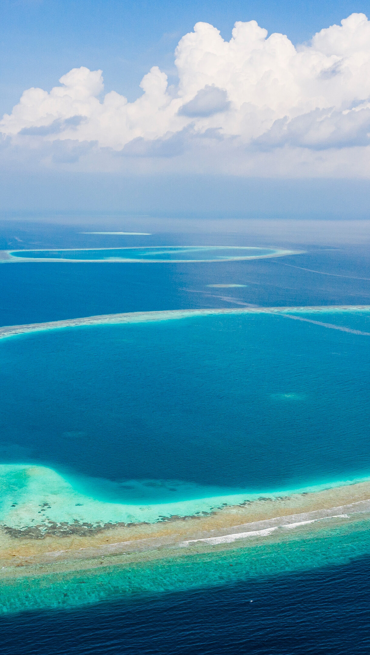 A breathtaking 4K wallpaper showcasing an aerial view of the stunning Maldives Atolls in the vast Indian Ocean. The crystal-clear turquoise lagoons are encircled by light coral reefs, dramatically contrasting with the deep indigo of the surrounding ocean under a bright, cloud-dotted sky.