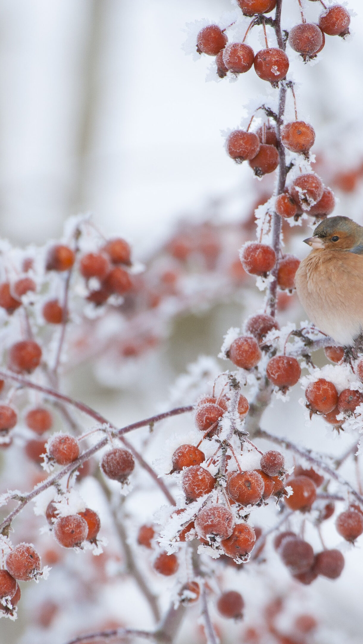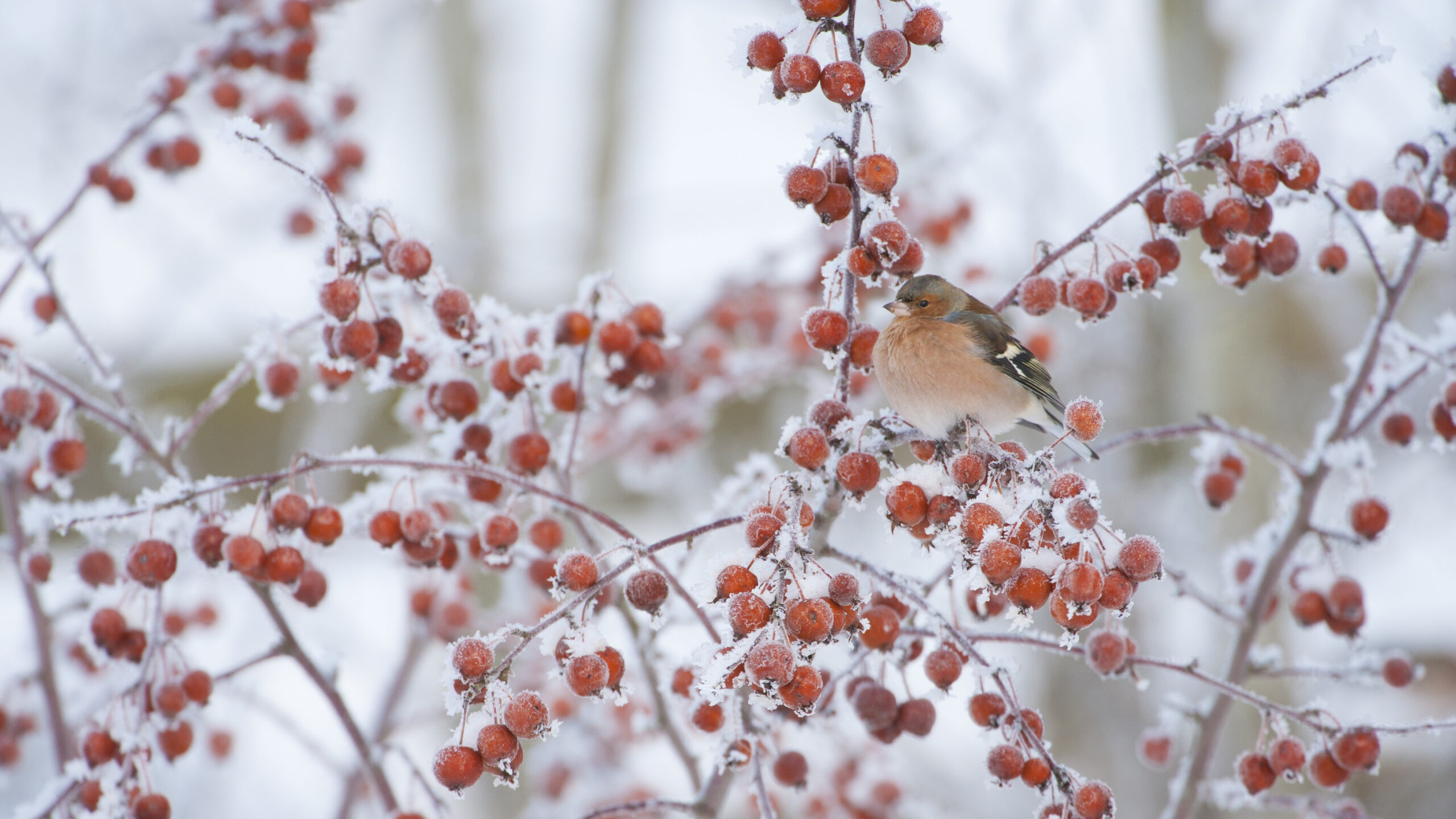 A crisp 4K wallpaper captures a male chaffinch perched among the branches of a frosted crab apple tree in winter. Its warm, subtle plumage provides a vivid contrast against the icy white frost coating the branches and the vibrant red crab apples, creating a striking and serene seasonal tableau.