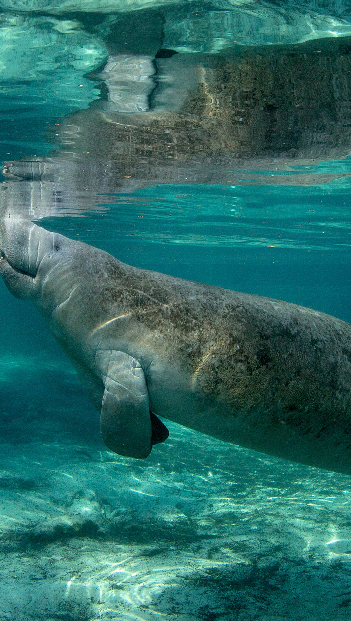 A breathtaking 4K wallpaper of a manatee gracefully swimming underwater in the crystal-clear waters of Three Sisters Springs. Sunlight filters through the surface, creating shimmering patterns on the sandy bottom and highlighting the manatee's textured skin as it nears the water's surface.