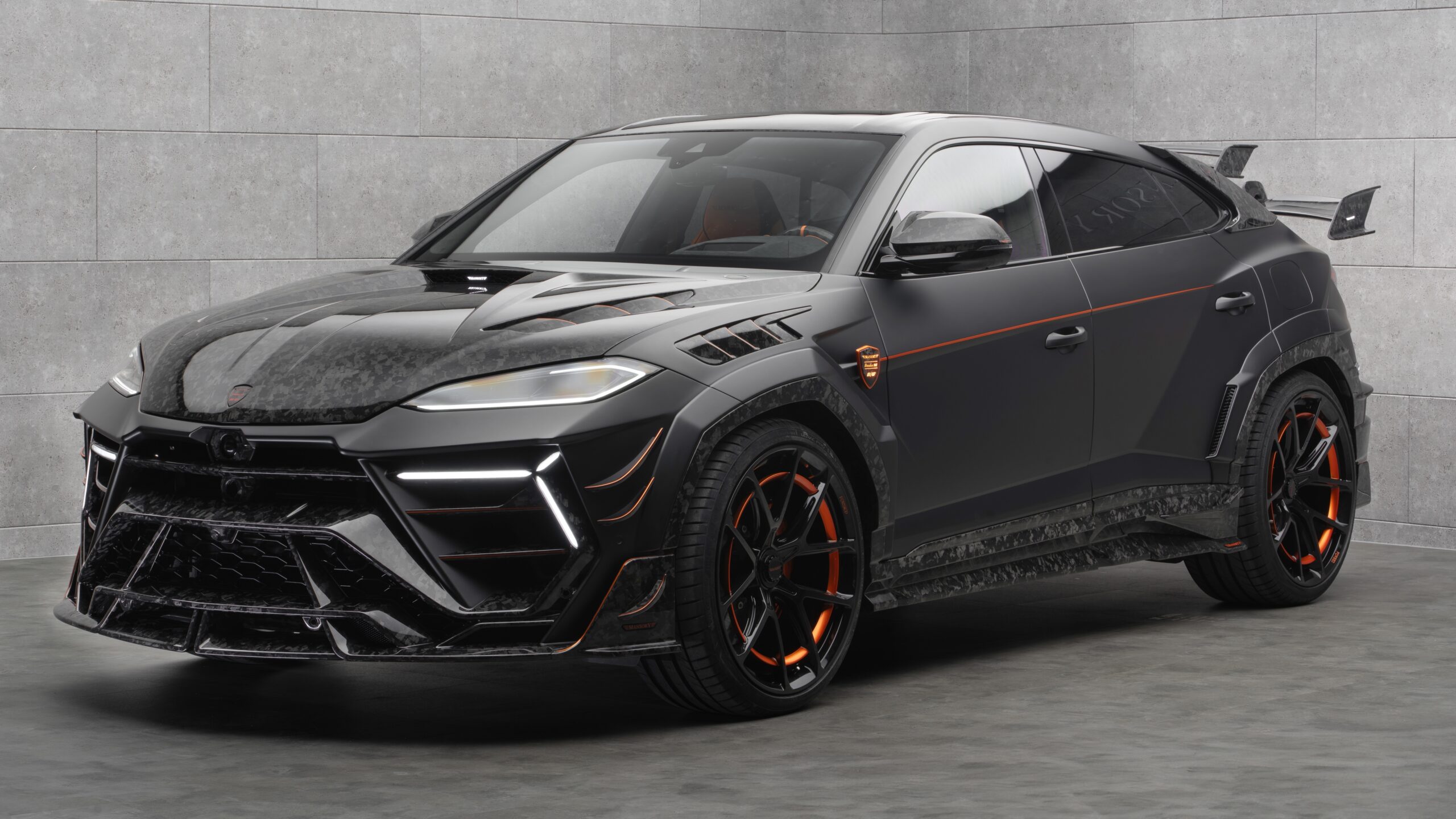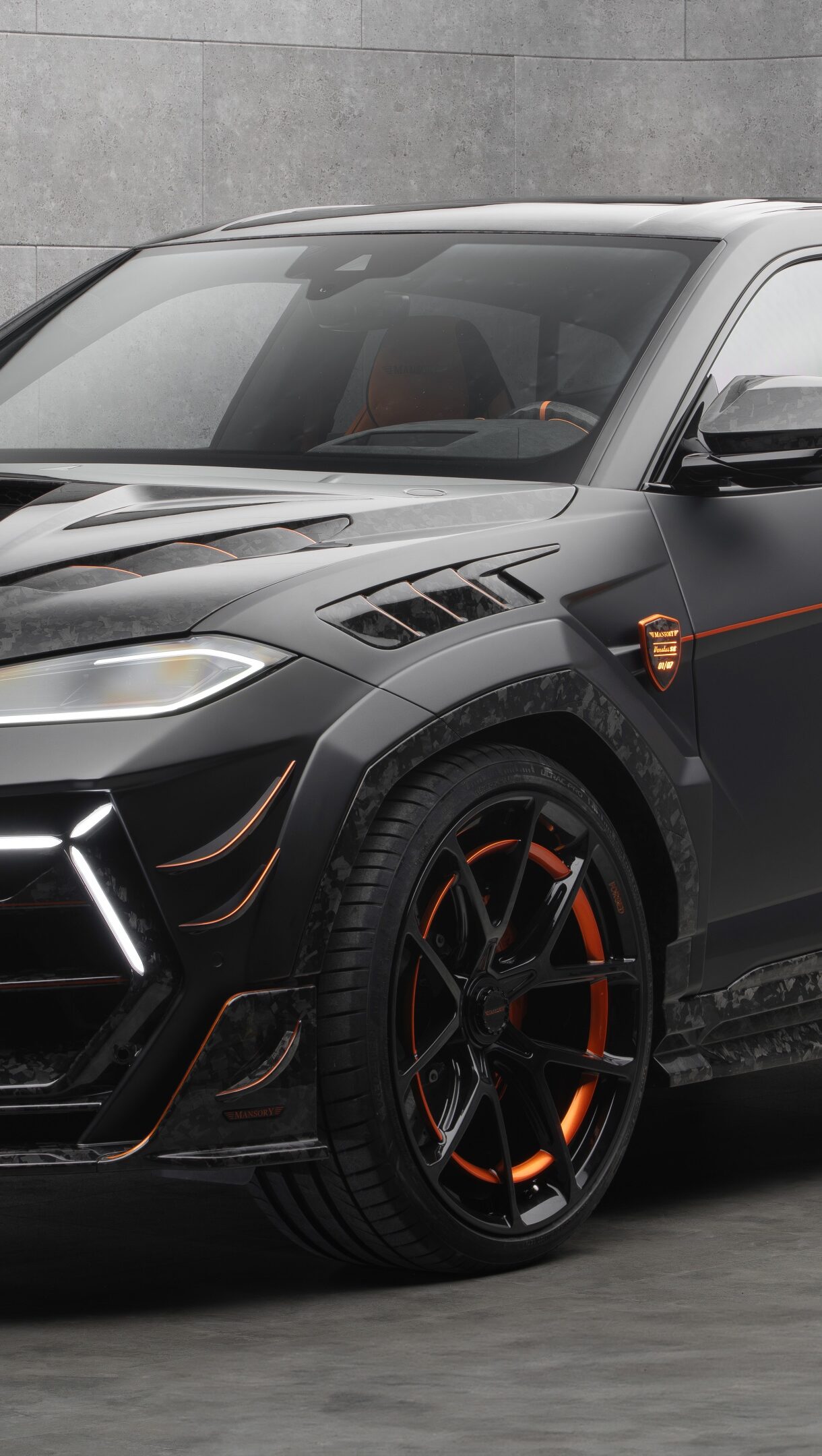 A powerful 4K wallpaper showcasing a Mansory Venatus Lamborghini Urus SE in matte black with striking orange accents, positioned dynamically within a clean, modern indoor space. Its aggressive carbon fiber body kit is accentuated by sharp orange lines and glowing wheel accents, creating a high-contrast and imposing presence against the subtle grey backdrop.