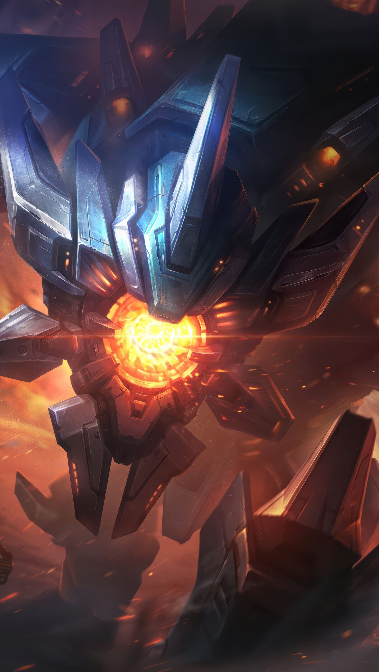 An epic 4K wallpaper features a colossal, dark metallic mecha dominating a chaotic, fiery battlefield. Its glowing orange core and radiant armaments cast an intense, destructive light across the smoky, debris-filled environment.