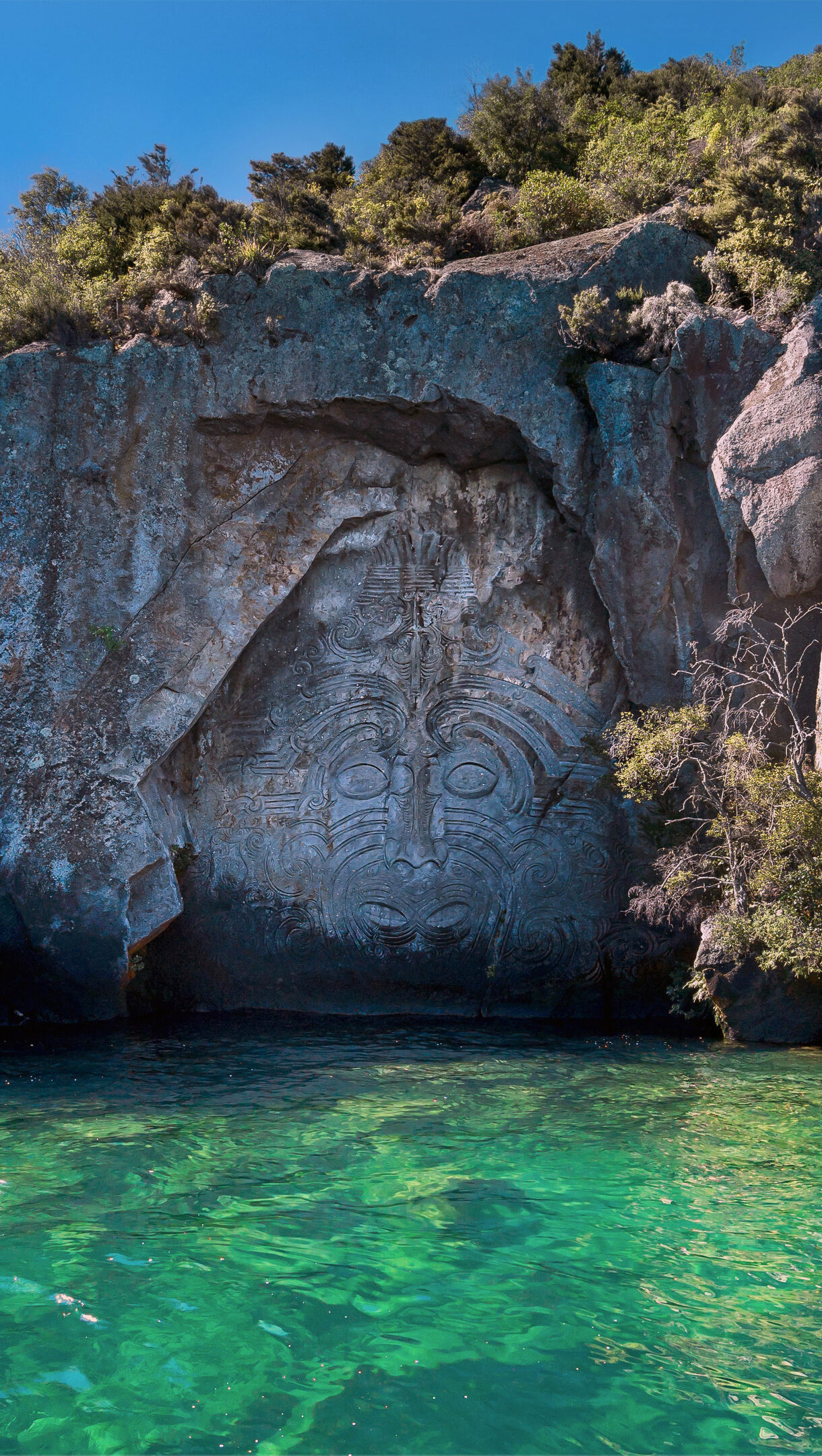A captivating 4K wallpaper featuring the monumental Māori Rock Carving of Matahi Whakataka-brightwell, majestically situated on a rugged cliff face rising from the clear waters of Lake Taupo in New Zealand. Sunlight illuminates the carving's intricate details and the strikingly vibrant, emerald-green lake, creating a powerful sense of ancient artistry meeting serene natural beauty.