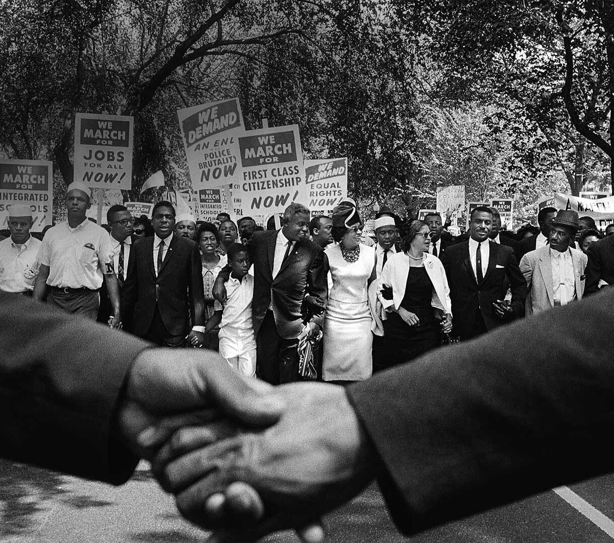 A historic 4K wallpaper capturing the iconic March on Washington, depicting a determined crowd of civil rights activists moving forward under a canopy of trees. In the foreground, a prominent handshake symbolizes the profound unity and shared purpose of the movement, rendered in timeless black and white.