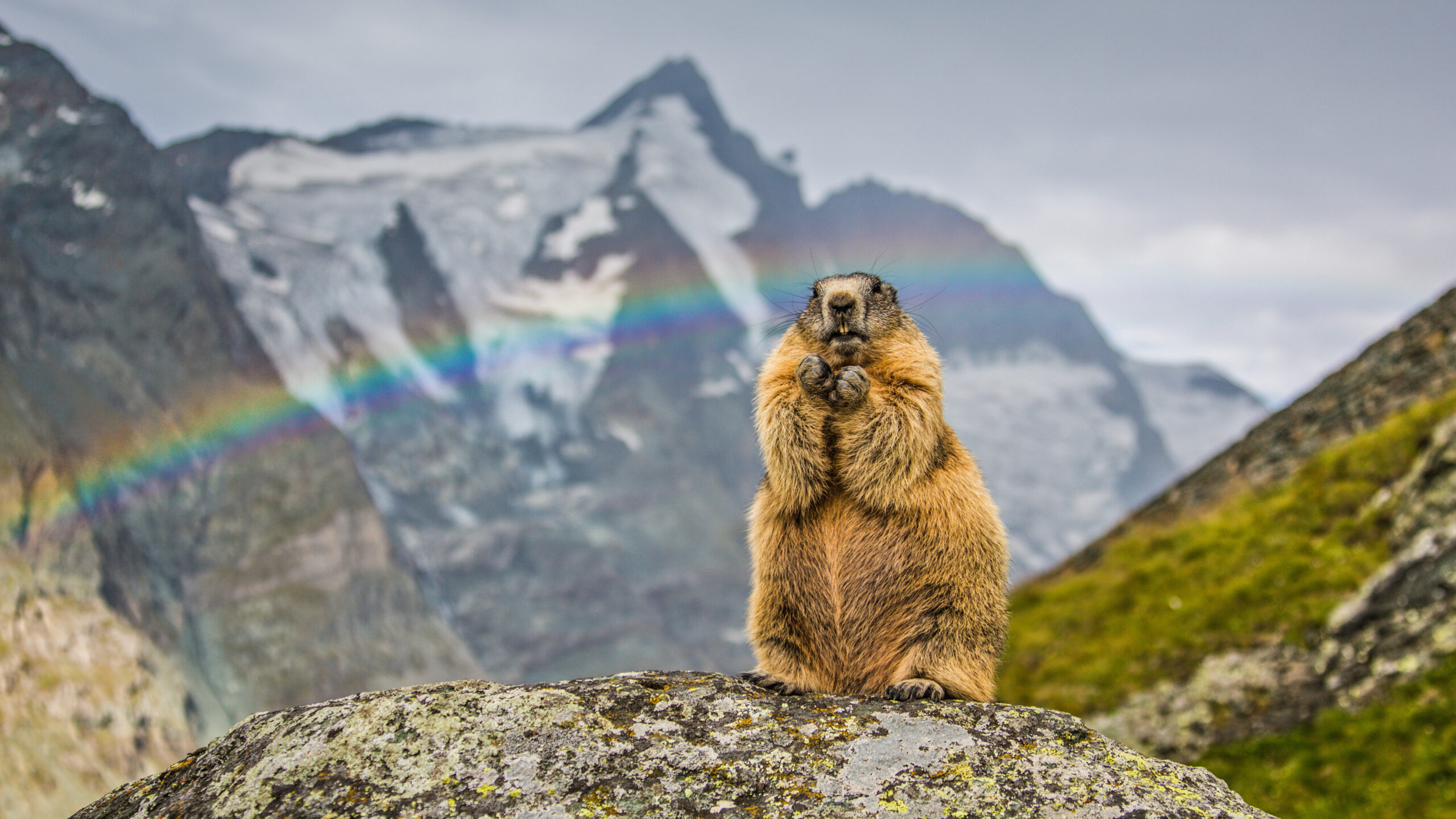 A magical 4K wallpaper of a marmot standing alert on a rock, set against the majestic Grossglockner Peak in Austria. A vibrant rainbow arcs gracefully across the snowy mountains behind it, adding an enchanting touch to the alpine scene.
