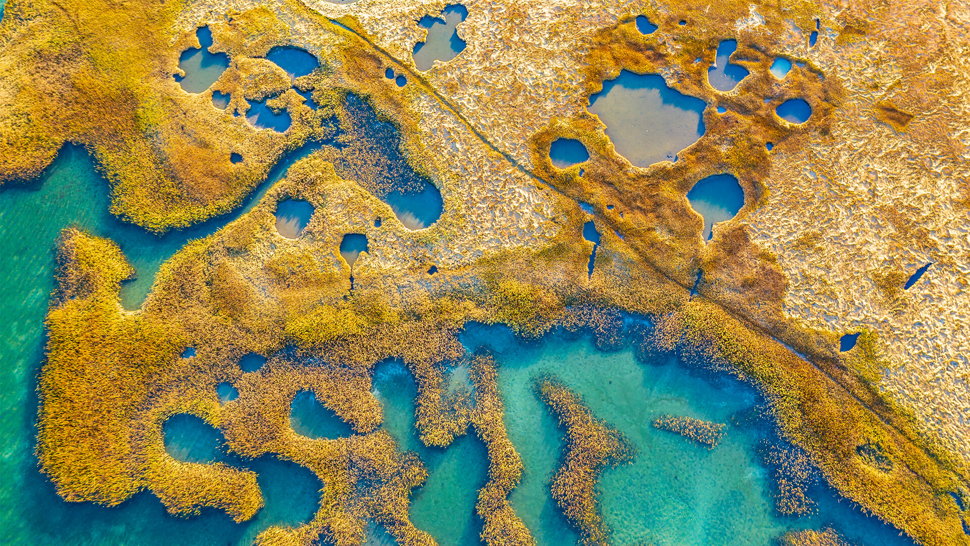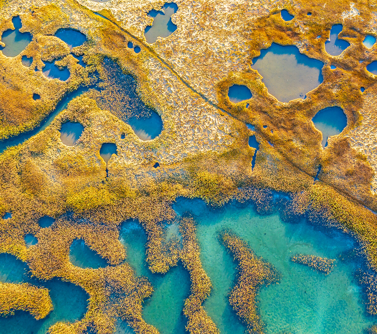A mesmerizing 4K wallpaper of an aerial view of marshland golden reeds and intricate water channels in Gloucester, Massachusetts. Sunlight illuminates the richly textured golden reeds, creating a stunning contrast with the winding turquoise water channels and pools.