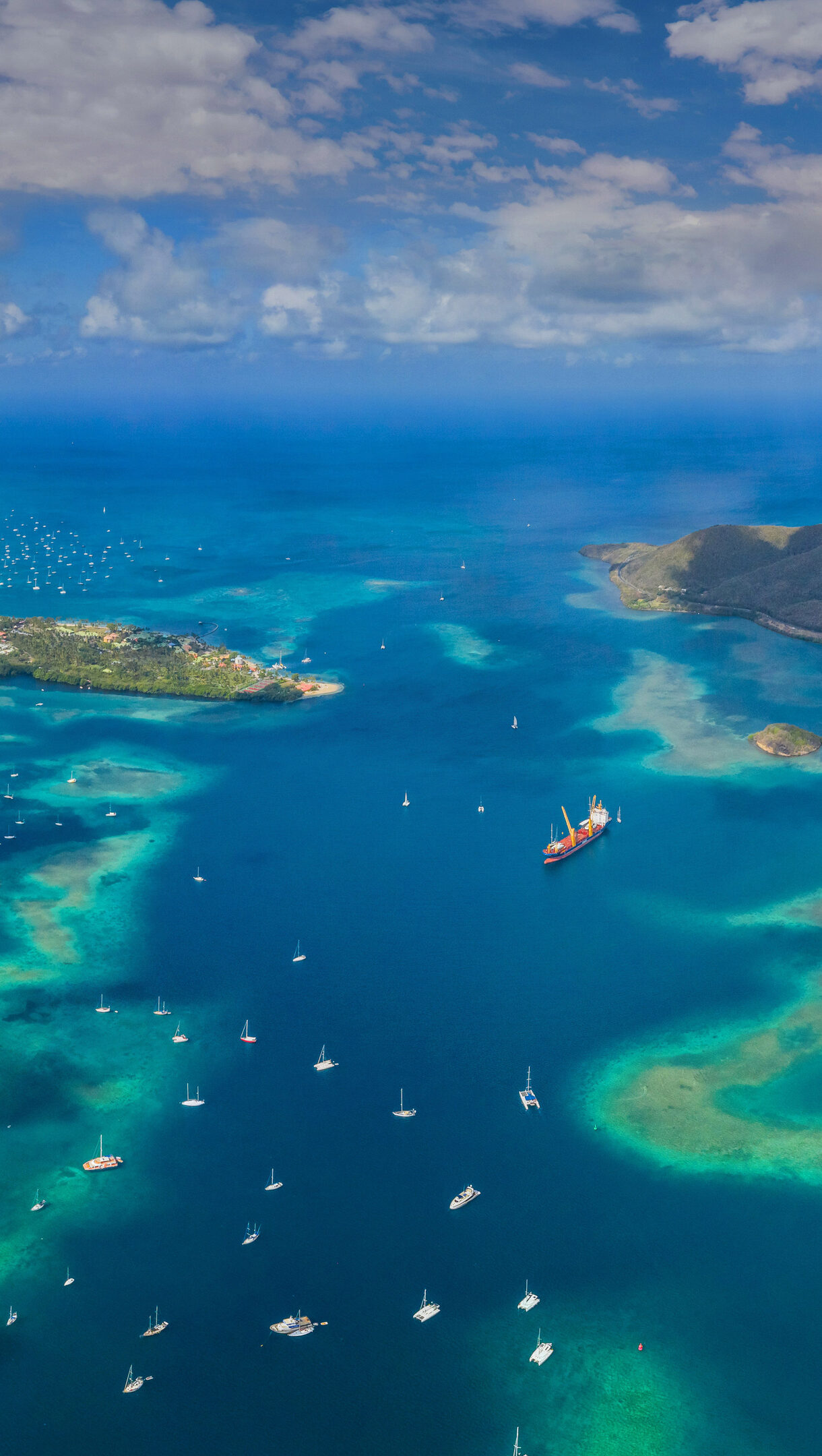 A breathtaking 4K wallpaper captures an aerial view of numerous boats dotting the crystal-clear turquoise waters of Martinique in the Lesser Antilles, Caribbean Sea. Sunlight beautifully illuminates the shallow coral reefs and deep blue channels, creating a mosaic of vivid colors against the lush green island and distant cloudy sky.