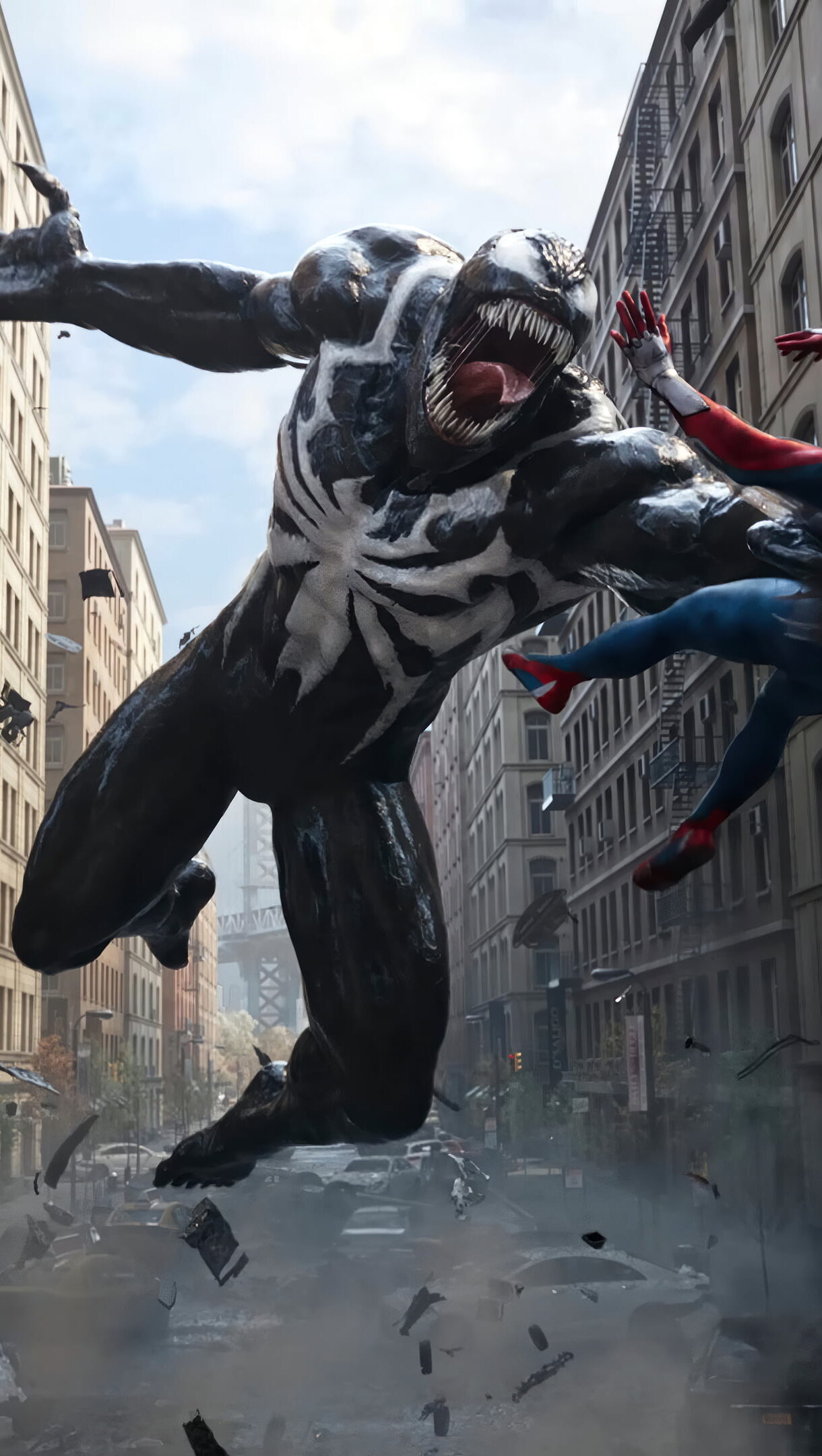 A riveting 4K wallpaper featuring Spider-Man and Venom from Marvel's Spider-Man 2, capturing an intense battle between hero and villain in stunning high resolution. Ideal for your desktop or device background. Simply click the download button to bring this masterpiece to life on your screen as a desktop wallpaper or save it for later in your picture collection.
