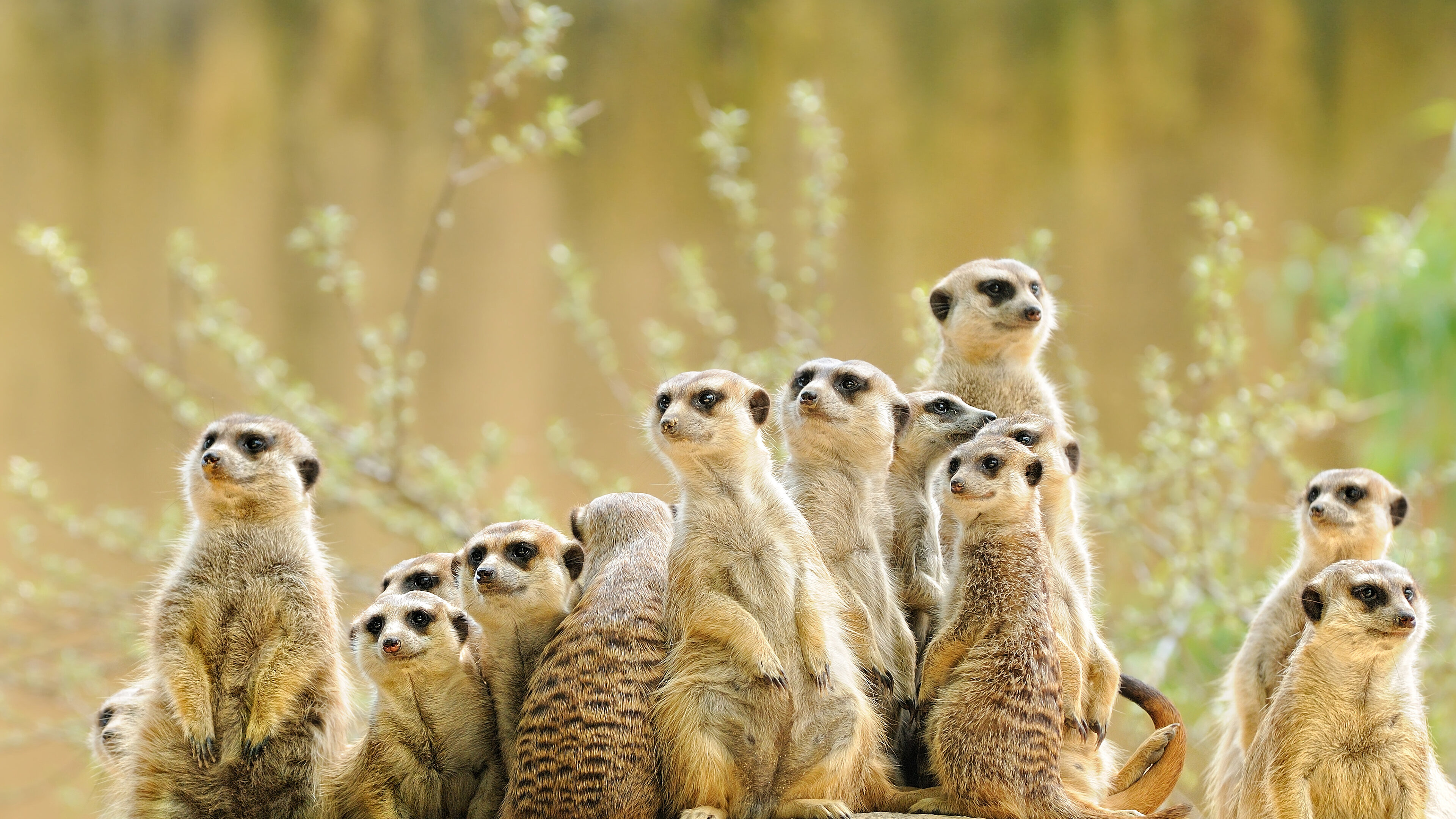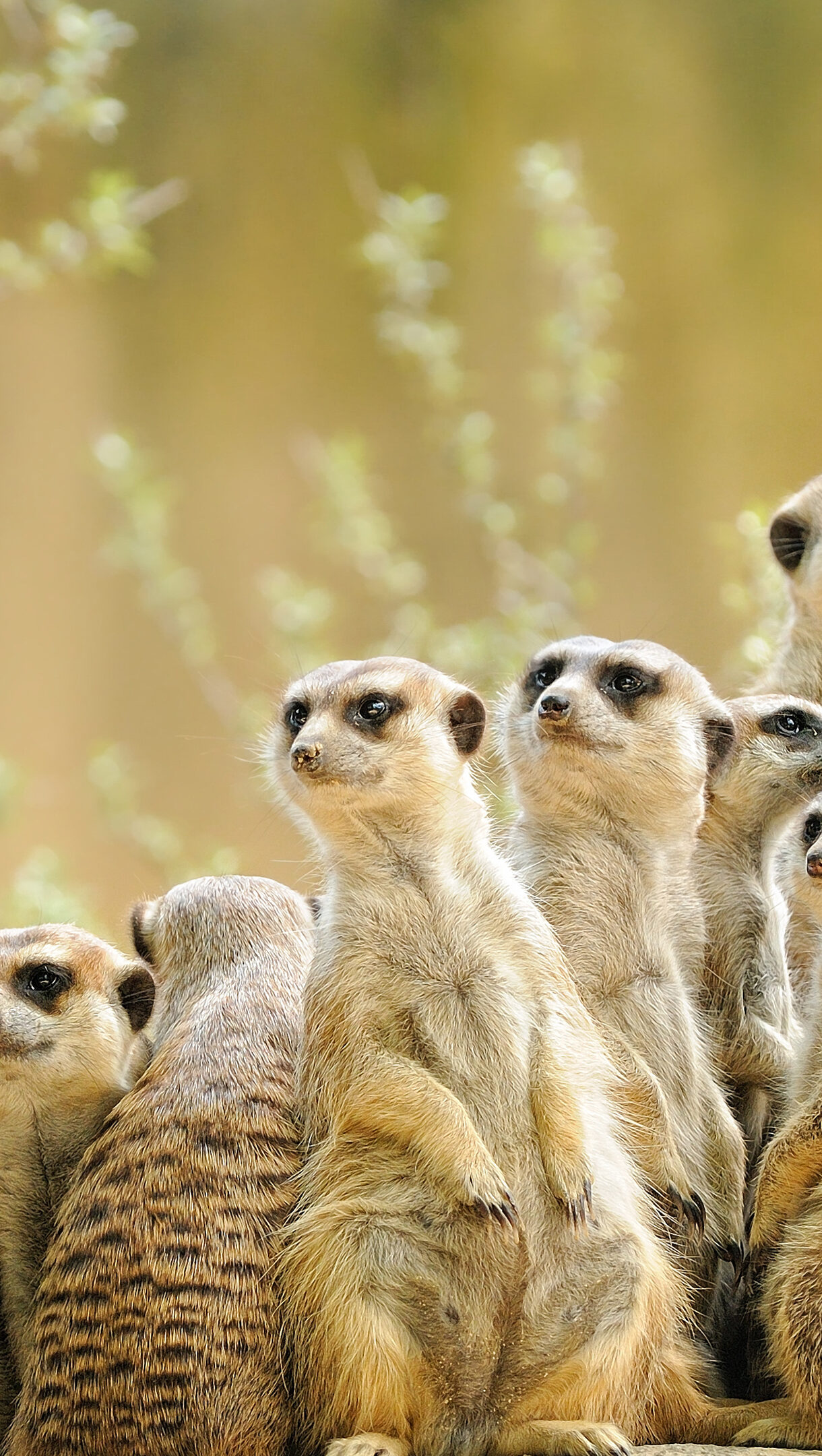 An engaging 4K wallpaper captures an adorable meerkat family group standing alert in a soft, natural setting. Each meerkat's vigilant gaze and upright posture, rendered in exquisite detail against the gently diffused foliage, conveys a sense of watchful unity.
