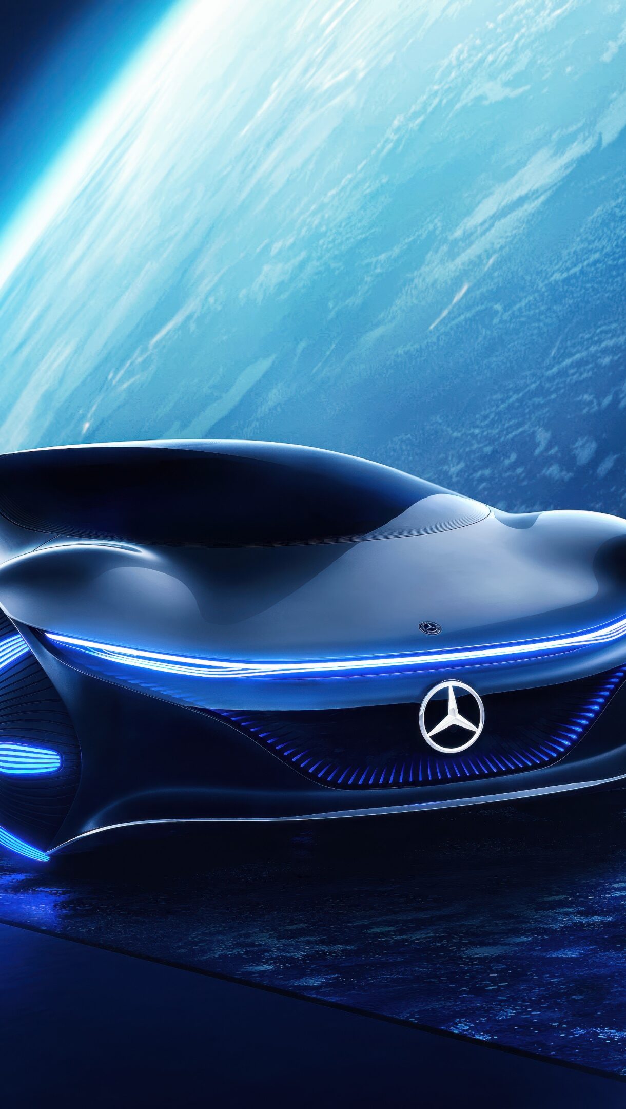 A breathtaking 4K wallpaper featuring the futuristic Mercedes-Benz VISION AVTR concept car in outer space. The sleek design of the vehicle is highlighted against a cosmic backdrop, evoking a sense of innovation and exploration.