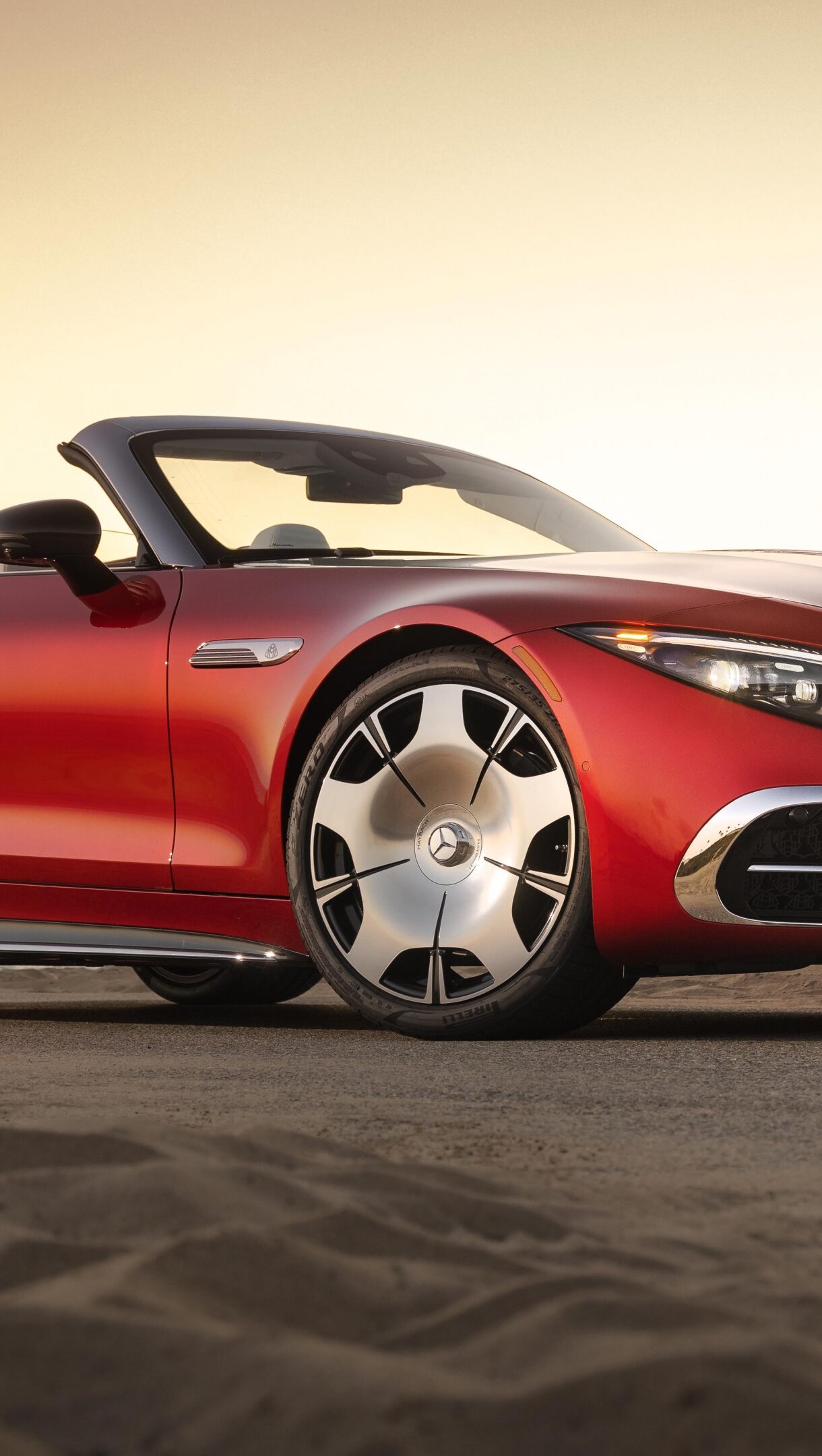 A breathtaking 4K wallpaper featuring the Mercedes-Maybach SL 680 2026, a luxurious red convertible, parked on an asphalt road beside a sandy beach with the ocean visible under a golden sunset sky. The warm light accentuates the car's elegant curves and unique chrome wheels, defining a mood of sophisticated serenity.