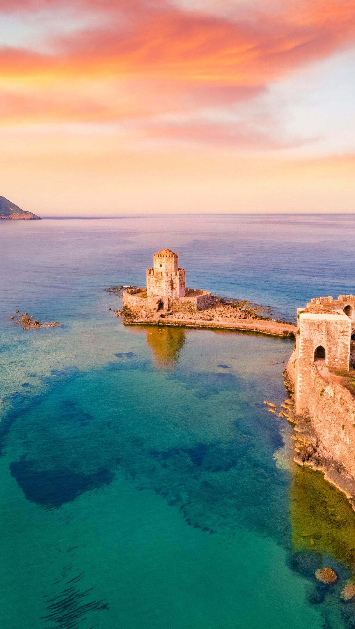 A captivating 4K wallpaper showcasing the ancient Methoni Castle ruins in Messenia, Greece, perched on a coastal peninsula with its octagonal Bourtzi fortress on an adjacent islet. The vivid hues of the sunset paint the sky in oranges and pinks, brilliantly reflecting upon the impossibly clear, multi-toned turquoise waters surrounding the historic stone fortifications.