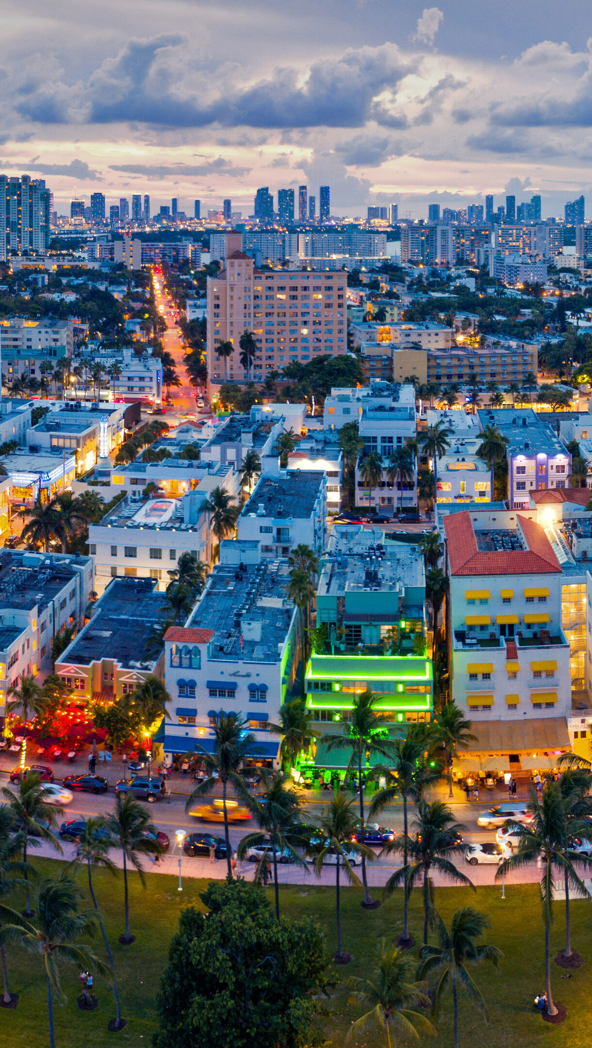 A dazzling 4K wallpaper depicting an aerial view of Miami Beach, Florida, illuminated at night. The vibrant neon lights of Art Deco buildings along Ocean Drive glow brightly, contrasting with the soft blues of the twilight sky and creating a lively, energetic mood.