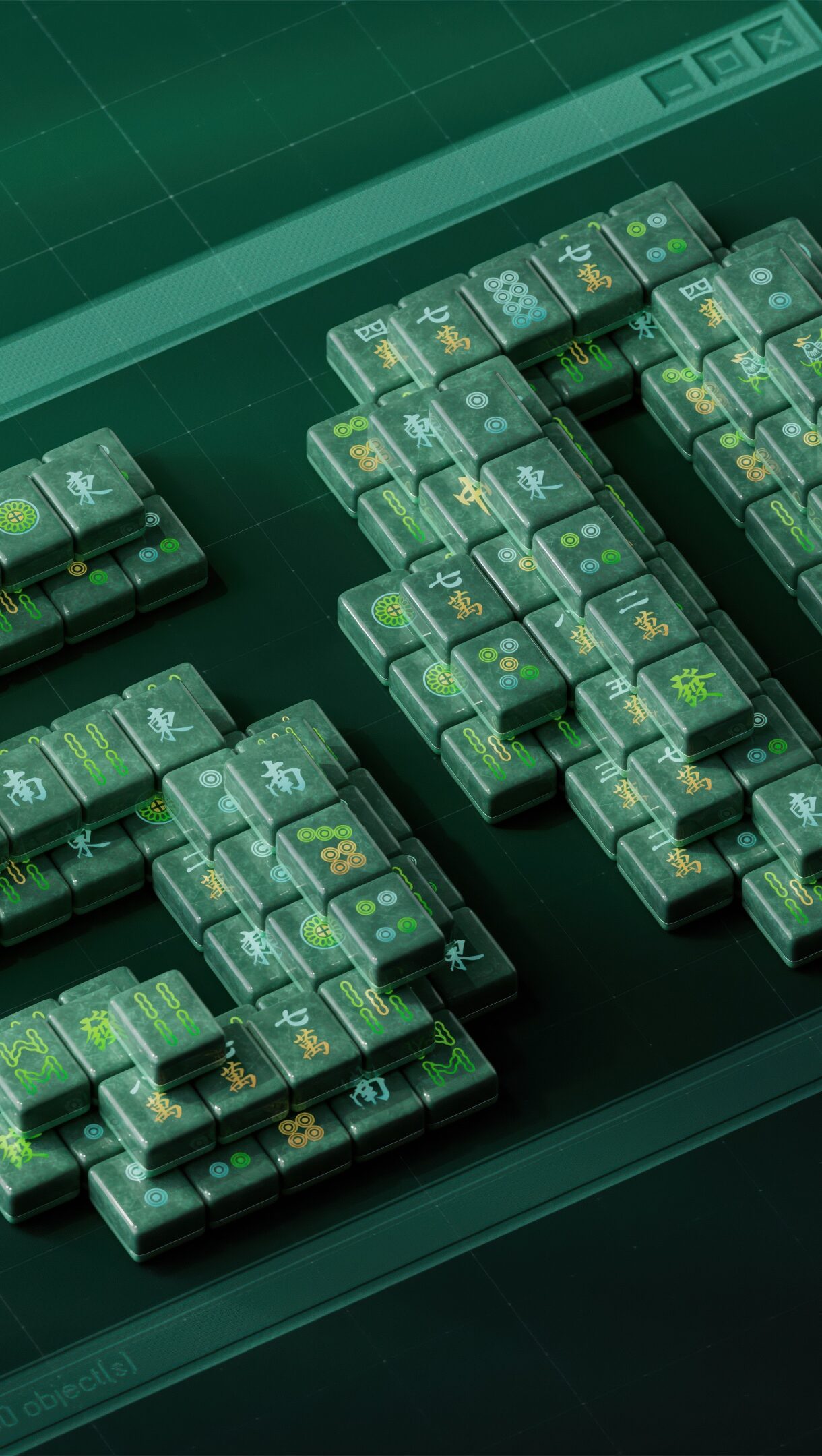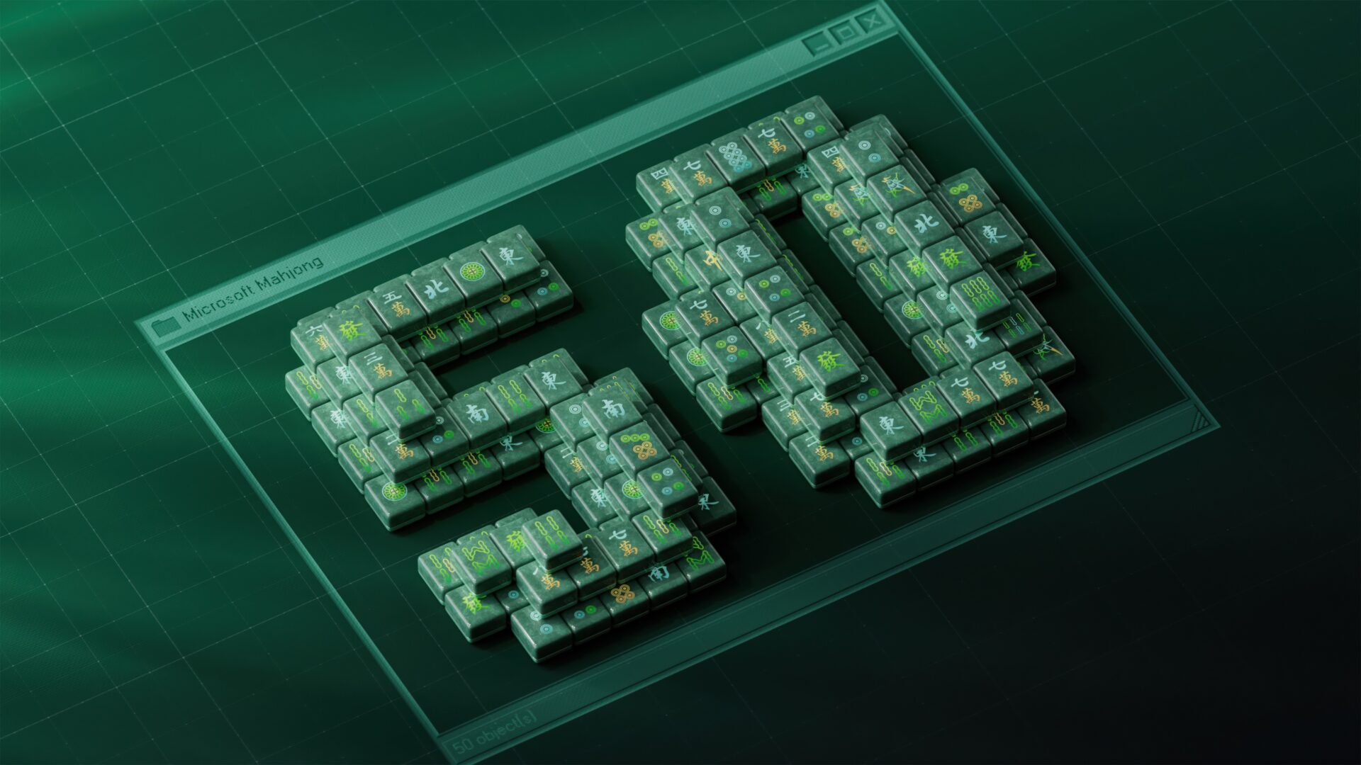 A sleek 4K wallpaper featuring fifty Microsoft Mahjong tiles intricately arranged to form the number '50' within a translucent, dark green computer window on a glowing grid background. The deep emerald and vibrant yellow-green symbols on the textured mahjong tiles glow subtly, creating a tranquil yet sophisticated digital mood.